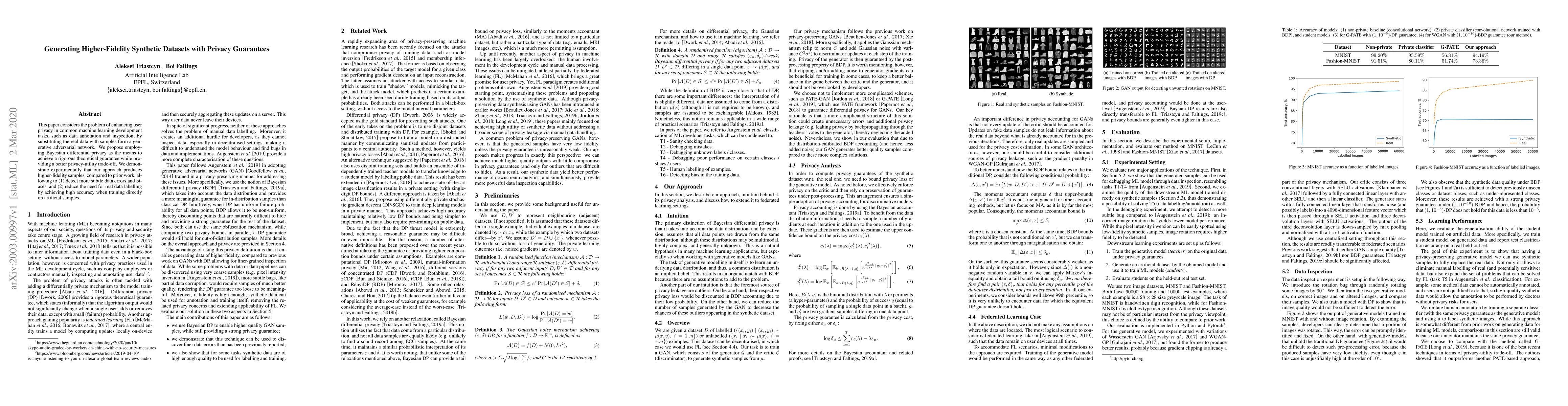 This paper considers the problem of enhancing user privacy in common machine learning development tasks, such as data annotation and inspection, by substituting the real data with samples form a generative adversarial network. We propose employing Bayesian differential privacy as the means to achieve a rigorous theoretical guarantee while providing a better privacy-utility trade-off. We demonstrate experimentally that our approach produces higher-fidelity samples, compared to prior work, allowing to (1) detect more subtle data errors and biases, and (2) reduce the need for real data labelling by achieving high accuracy when training directly on artificial samples.