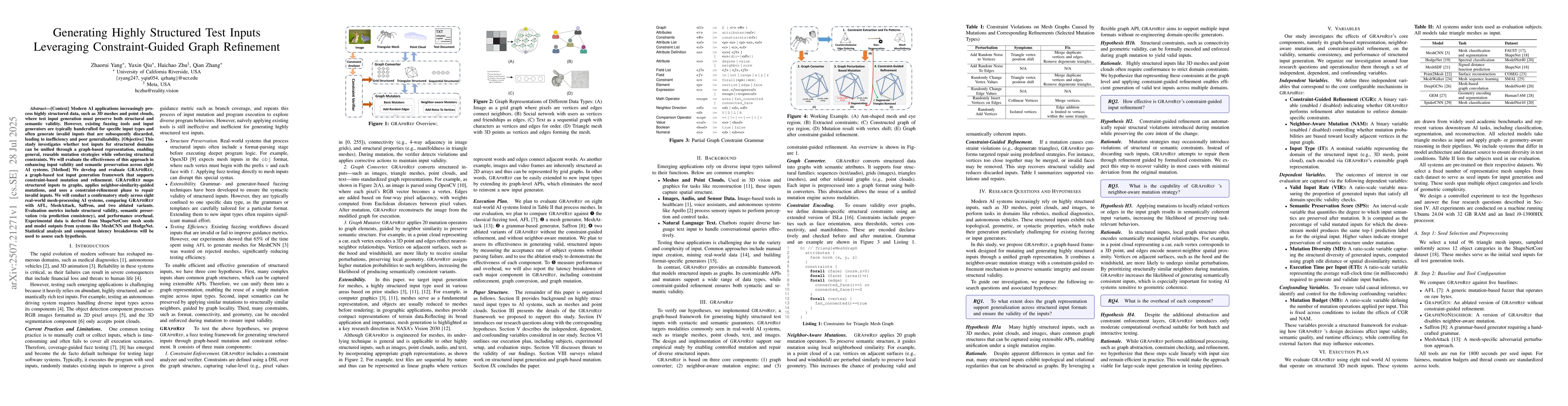 [Context] Modern AI applications increasingly process highly structured data, such as 3D meshes and point clouds, where test input generation must preserve both structural and semantic validity. However, existing fuzzing tools and input generators are typically handcrafted for specific input types and often generate invalid inputs that are subsequently discarded, leading to inefficiency and poor generalizability. [Objective] This study investigates whether test inputs for structured domains can be unified through a graph-based representation, enabling general, reusable mutation strategies while enforcing structural constraints. We will evaluate the effectiveness of this approach in enhancing input validity and semantic preservation across eight AI systems. [Method] We develop and evaluate GRAphRef, a graph-based test input generation framework that supports constraint-based mutation and refinement. GRAphRef maps structured inputs to graphs, applies neighbor-similarity-guided mutations, and uses a constraint-refinement phase to repair invalid inputs. We will conduct a confirmatory study across eight real-world mesh-processing AI systems, comparing GRAphRef with AFL, MeshAttack, Saffron, and two ablated variants. Evaluation metrics include structural validity, semantic preservation (via prediction consistency), and performance overhead. Experimental data is derived from ShapeNetCore mesh seeds and model outputs from systems like MeshCNN and HodgeNet. Statistical analysis and component latency breakdowns will be used to assess each hypothesis.