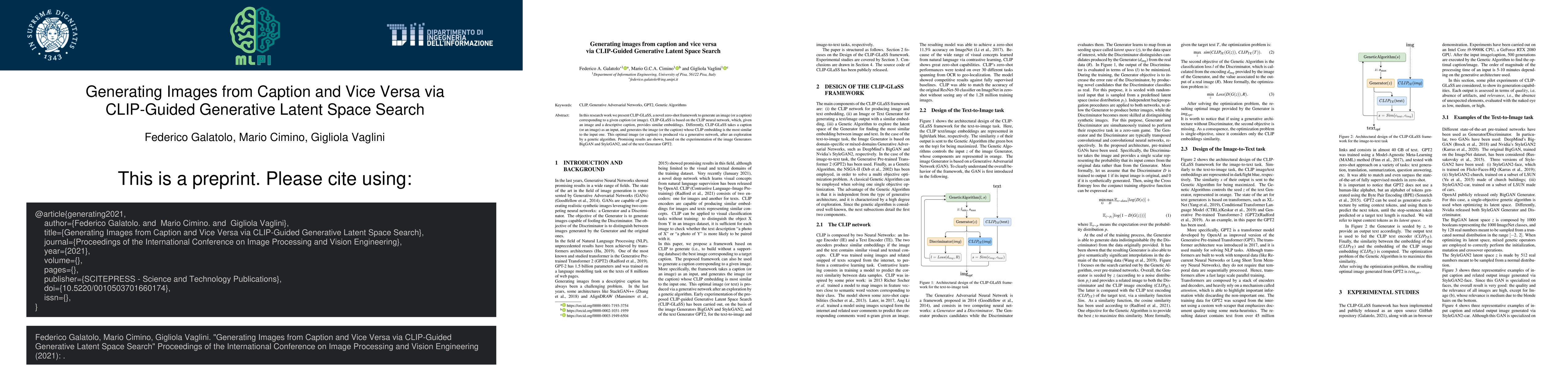 This paper introduces CLIP-GLaSS, a zero-shot framework using CLIP embeddings to generate images from captions and vice versa. It employs a genetic algorithm to explore the generative latent space, achieving promising results with BigGAN, StyleGAN2, and GPT2.