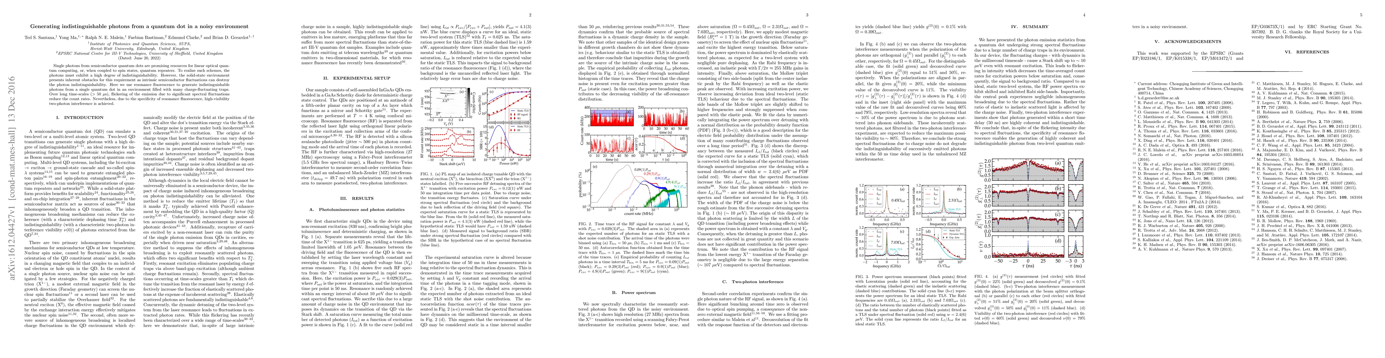 This paper investigates generating single, indistinguishable photons from a quantum dot in a noisy environment using resonance fluorescence, achieving high-visibility two-photon interference despite significant spectral fluctuations and charge-fluctuating traps over timescales of more than 50 microseconds.