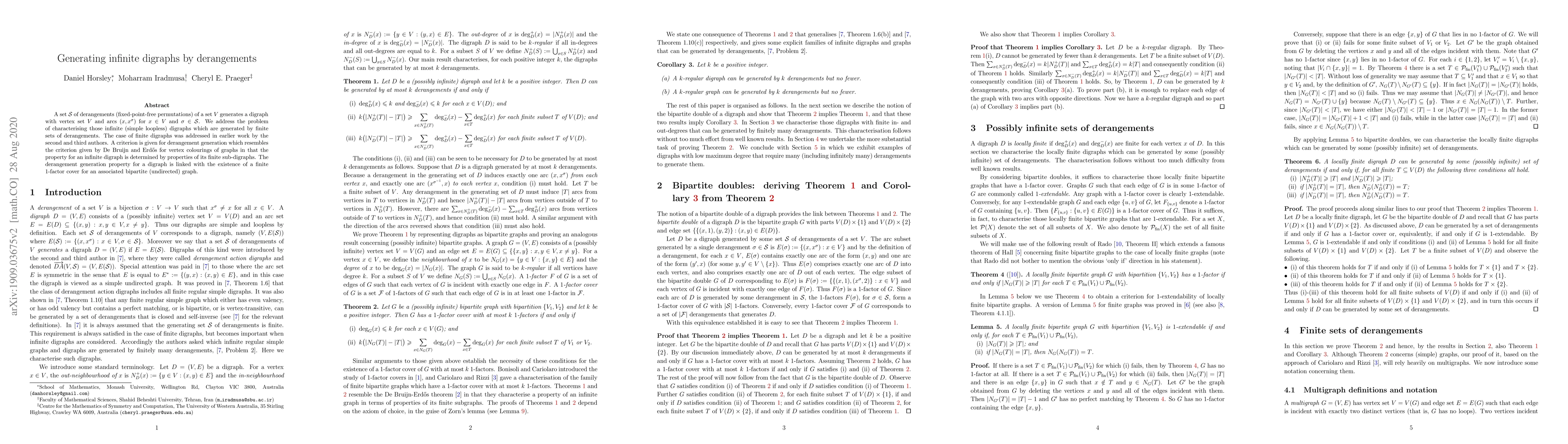 This paper explores infinite digraphs generated by finite sets of derangements, providing a criterion for their generation akin to De Bruijn and Erdős's criterion for graph colorings. It links the generation property to the existence of a finite 1-factor cover in an associated bipartite graph.