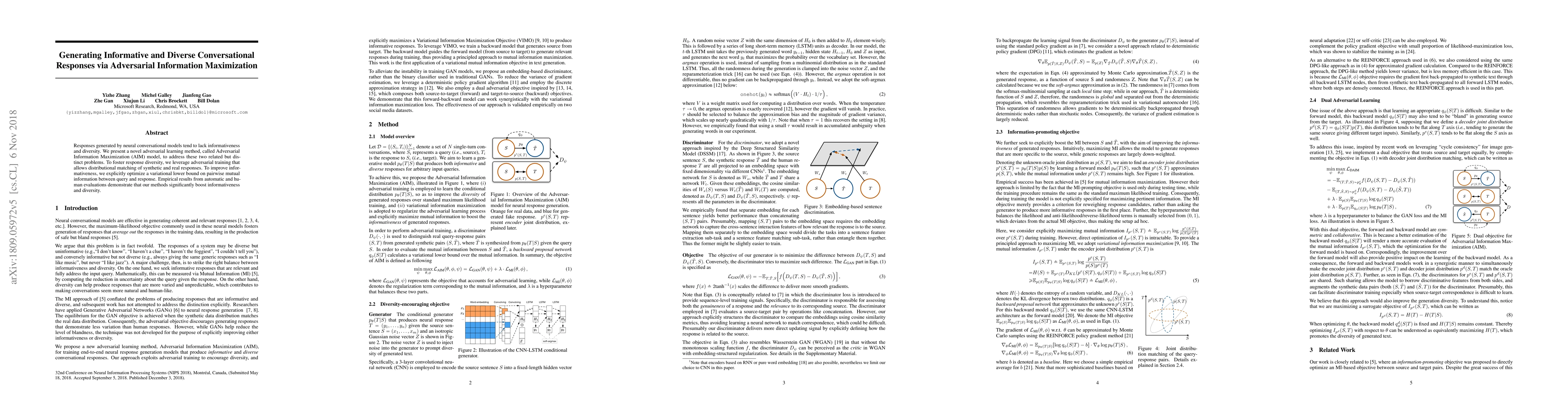 The paper introduces Adversarial Information Maximization (AIM) to enhance the informativeness and diversity of conversational responses generated by neural models. AIM uses adversarial training for diversity and optimizes mutual information for informativeness, resulting in significant improvements as shown by both automatic and human evaluations.