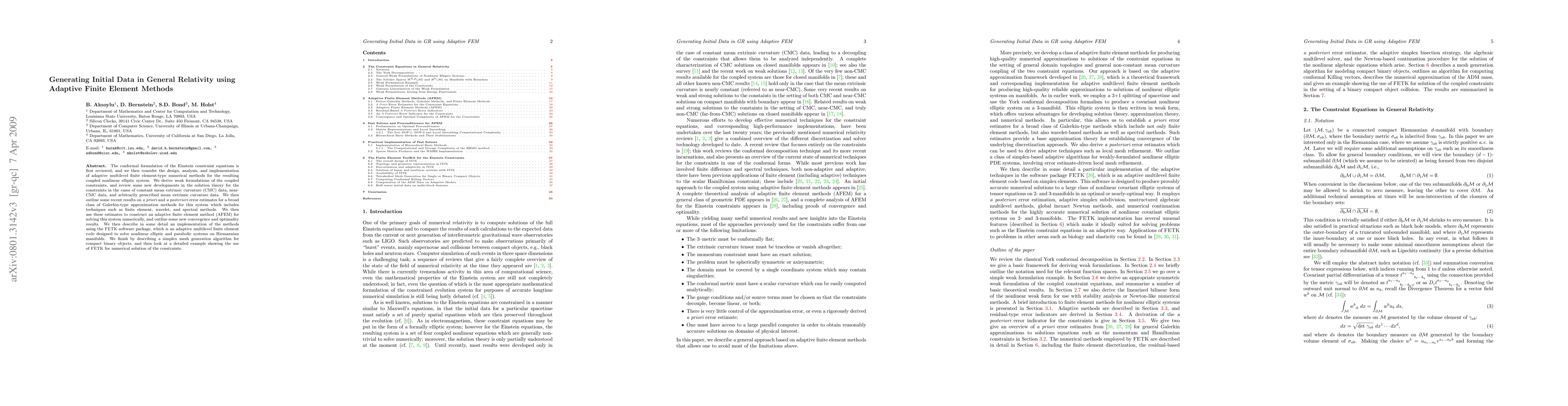 The conformal formulation of the Einstein constraint equations is first reviewed, and we then consider the design, analysis, and implementation of adaptive multilevel finite element-type numerical methods for the resulting coupled nonlinear elliptic system. We derive weak formulations of the coupled constraints, and review some new developments in the solution theory for the constraints in the cases of constant mean extrinsic curvature (CMC) data, near-CMC data, and arbitrarily prescribed mean extrinsic curvature data. We then outline some recent results on a priori and a posteriori error estimates for a broad class of Galerkin-type approximation methods for this system which includes techniques such as finite element, wavelet, and spectral methods. We then use these estimates to construct an adaptive finite element method (AFEM) for solving this system numerically, and outline some new convergence and optimality results. We then describe in some detail an implementation of the methods using the FETK software package, which is an adaptive multilevel finite element code designed to solve nonlinear elliptic and parabolic systems on Riemannian manifolds. We finish by describing a simplex mesh generation algorithm for compact binary objects, and then look at a detailed example showing the use of FETK for numerical solution of the constraints.
