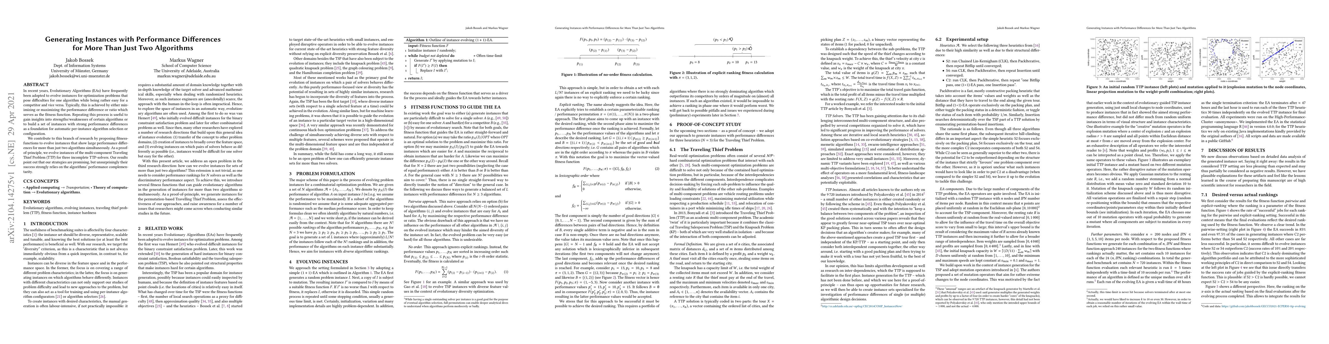 This research develops methods to generate problem instances that highlight performance differences among multiple algorithms simultaneously, using evolutionary algorithms. The approach helps identify strengths and weaknesses of different algorithms, with promising results demonstrated on complex Traveling Thief Problem solvers.