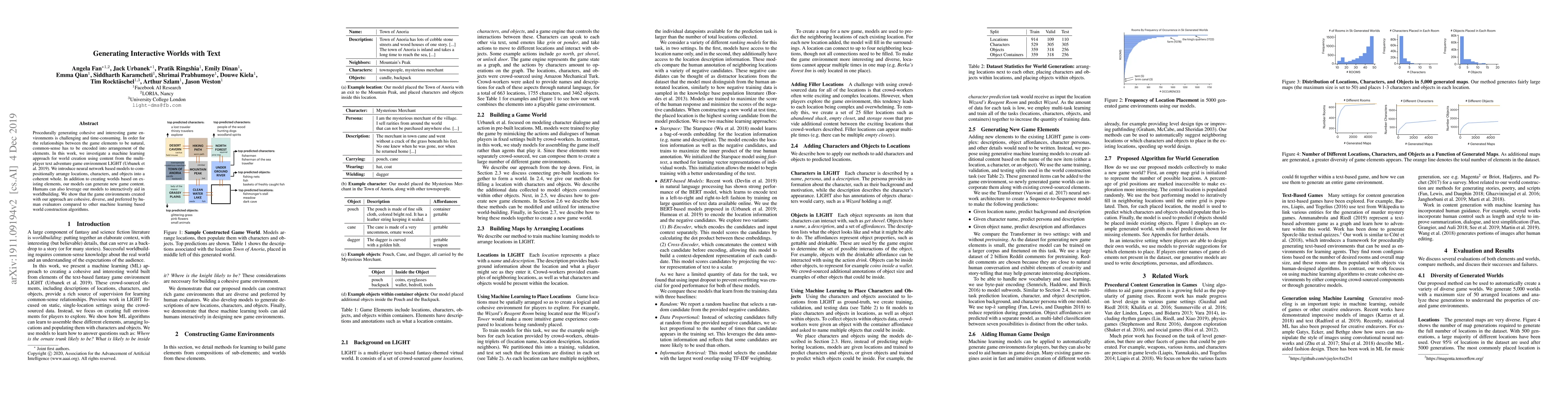 Procedurally generating cohesive and interesting game environments is challenging and time-consuming. In order for the relationships between the game elements to be natural, common-sense has to be encoded into arrangement of the elements. In this work, we investigate a machine learning approach for world creation using content from the multi-player text adventure game environment LIGHT. We introduce neural network based models to compositionally arrange locations, characters, and objects into a coherent whole. In addition to creating worlds based on existing elements, our models can generate new game content. Humans can also leverage our models to interactively aid in worldbuilding. We show that the game environments created with our approach are cohesive, diverse, and preferred by human evaluators compared to other machine learning based world construction algorithms.