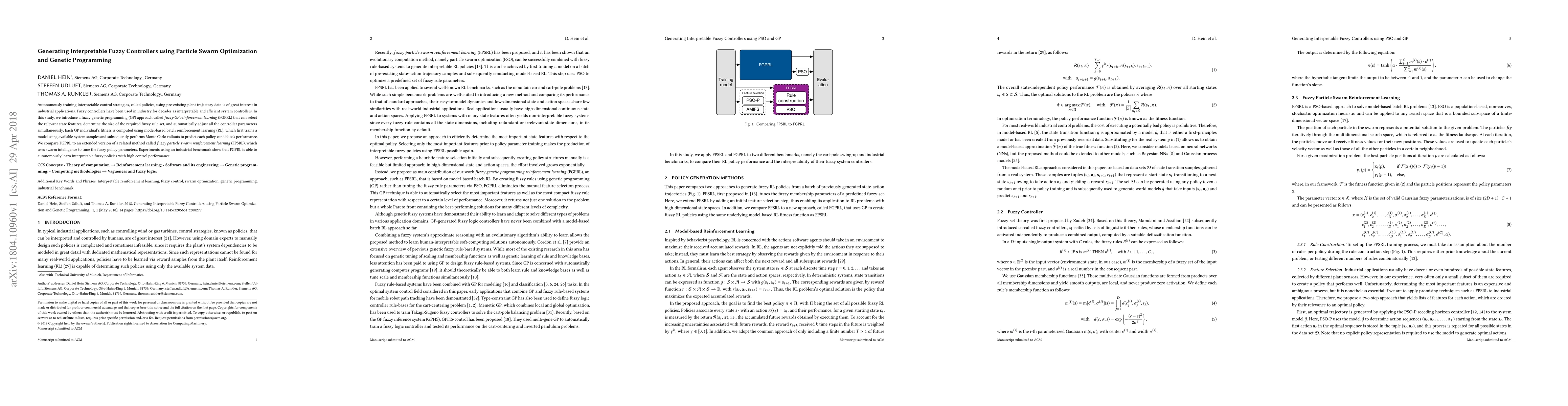 This paper presents a fuzzy genetic programming approach, fuzzy GP reinforcement learning (FGPRL), to autonomously train interpretable fuzzy controllers using particle swarm optimization and genetic programming. FGPRL outperforms a related method, fuzzy particle swarm reinforcement learning (FPSRL), in learning high-performing, interpretable fuzzy policies on an industrial benchmark.