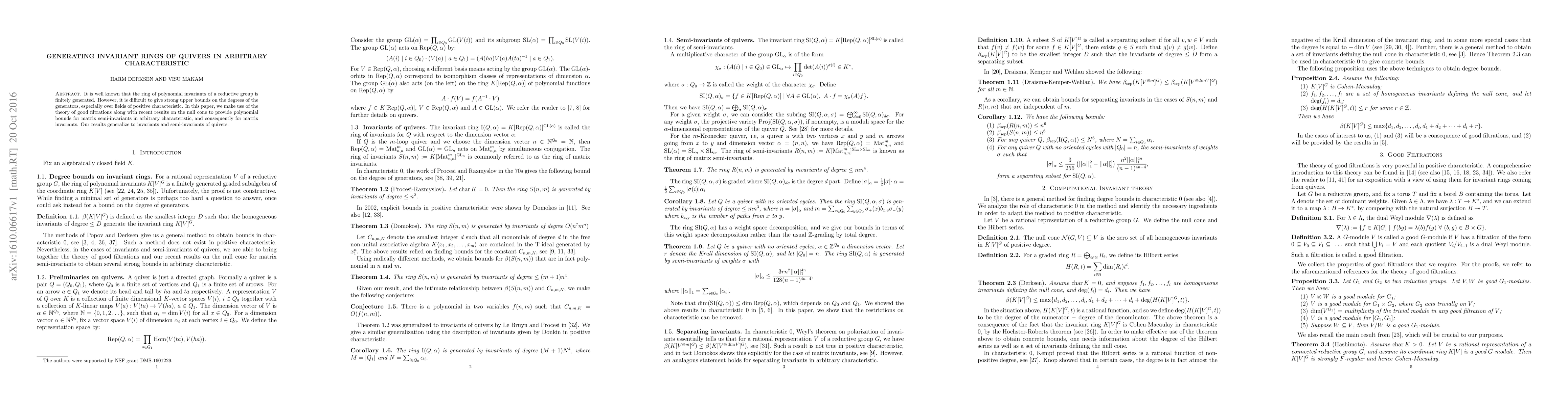 This paper develops polynomial bounds for the degrees of generators of invariant rings for reductive groups and quivers, leveraging good filtrations and null cone results, applicable in any field characteristic. The findings generalize to matrix semi-invariants and invariants in arbitrary characteristic.