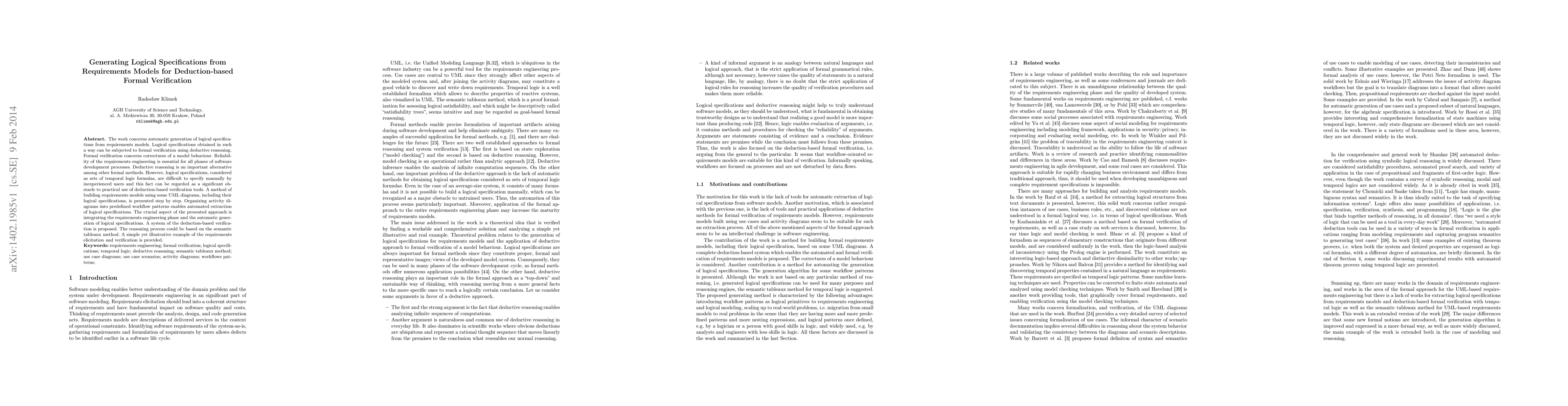 The work concerns automatic generation of logical specifications from requirements models. Logical specifications obtained in such a way can be subjected to formal verification using deductive reasoning. Formal verification concerns correctness of a model behaviour. Reliability of the requirements engineering is essential for all phases of software development processes. Deductive reasoning is an important alternative among other formal methods. However, logical specifications, considered as sets of temporal logic formulas, are difficult to specify manually by inexperienced users and this fact can be regarded as a significant obstacle to practical use of deduction-based verification tools. A method of building requirements models using some UML diagrams, including their logical specifications, is presented step by step. Organizing activity diagrams into predefined workflow patterns enables automated extraction of logical specifications. The crucial aspect of the presented approach is integrating the requirements engineering phase and the automatic generation of logical specifications. A system of the deduction-based verification is proposed. The reasoning process could be based on the semantic tableaux method. A simple yet illustrative example of the requirements elicitation and verification is provided.