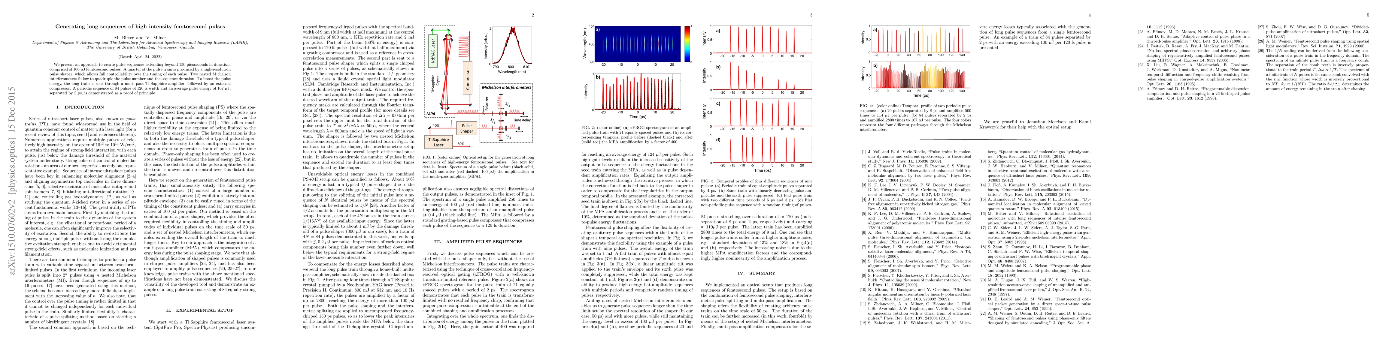 This paper details a method for generating long sequences of high-intensity femtosecond pulses, utilizing a pulse shaper, interferometers, and a Ti:Sapphire amplifier to create a train of 84 pulses with 120 fs width and 107 µJ energy, separated by 2 ps. The approach demonstrates control over pulse timing and energy boosting.