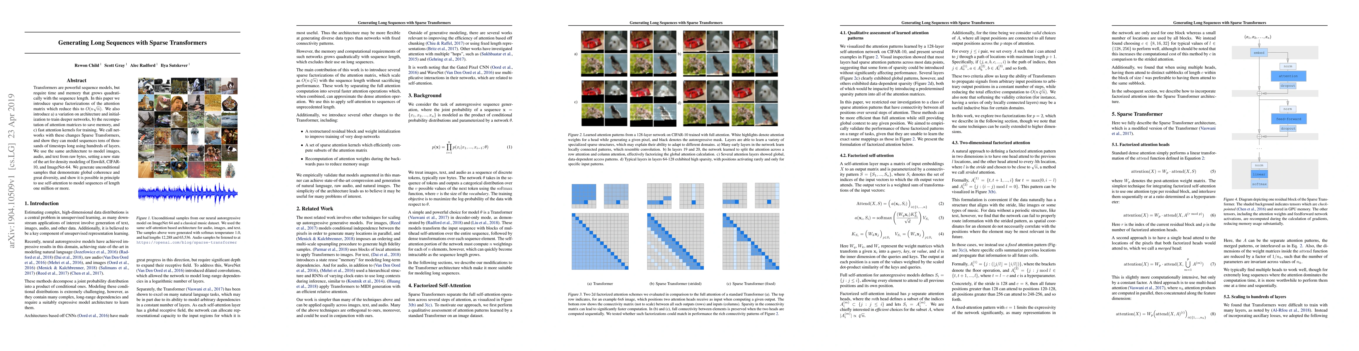 Transformers are powerful sequence models, but require time and memory that grows quadratically with the sequence length. In this paper we introduce sparse factorizations of the attention matrix which reduce this to $O(n \sqrt{n})$. We also introduce a) a variation on architecture and initialization to train deeper networks, b) the recomputation of attention matrices to save memory, and c) fast attention kernels for training. We call networks with these changes Sparse Transformers, and show they can model sequences tens of thousands of timesteps long using hundreds of layers. We use the same architecture to model images, audio, and text from raw bytes, setting a new state of the art for density modeling of Enwik8, CIFAR-10, and ImageNet-64. We generate unconditional samples that demonstrate global coherence and great diversity, and show it is possible in principle to use self-attention to model sequences of length one million or more.