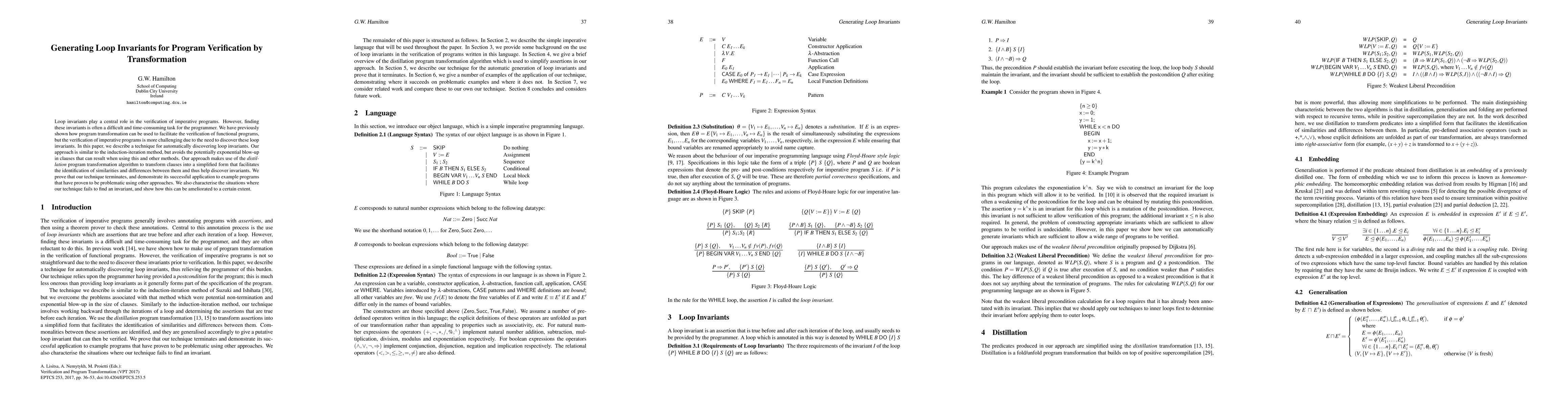 This paper presents an automated technique for discovering loop invariants in imperative programs using program transformation, specifically the distillation algorithm. It avoids exponential clause expansion issues common in induction-iteration methods and successfully applies to challenging example programs, while also discussing failure scenarios and their mitigation.
