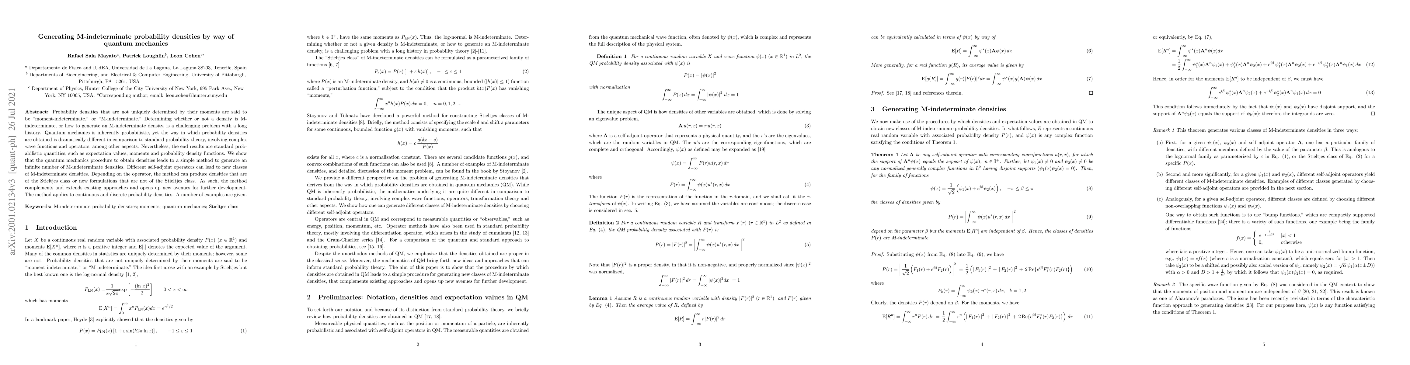 This paper demonstrates a novel method to generate M-indeterminate probability densities using quantum mechanics, showing that quantum procedures can produce densities not uniquely determined by their moments, thus extending existing probabilistic approaches. The method applies to both continuous and discrete densities and introduces new classes of M-indeterminate densities.