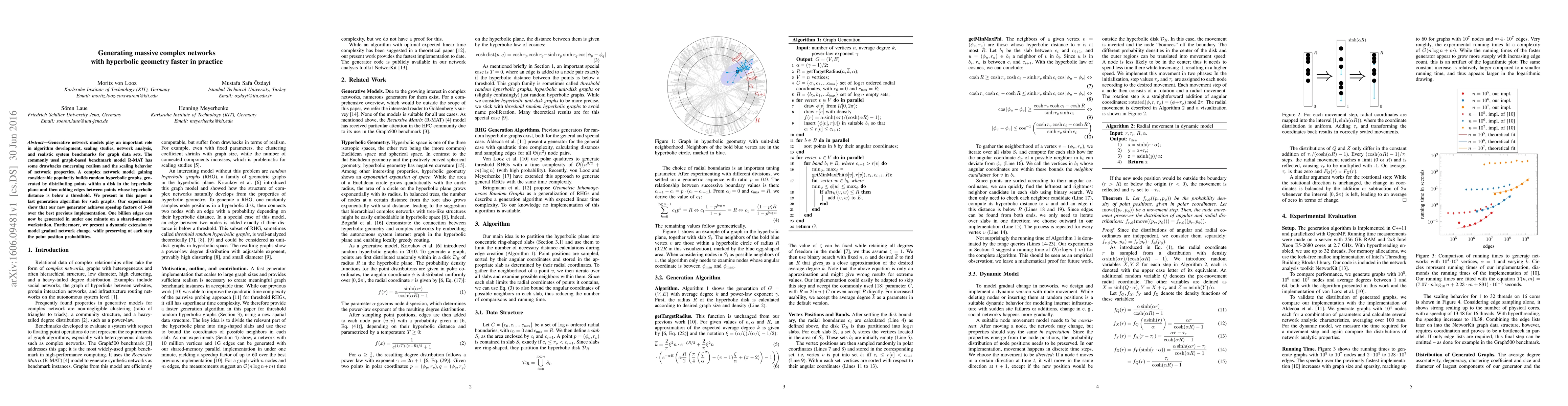 Generative network models play an important role in algorithm development, scaling studies, network analysis, and realistic system benchmarks for graph data sets. The commonly used graph-based benchmark model R-MAT has some drawbacks concerning realism and the scaling behavior of network properties. A complex network model gaining considerable popularity builds random hyperbolic graphs, generated by distributing points within a disk in the hyperbolic plane and then adding edges between points whose hyperbolic distance is below a threshold. We present in this paper a fast generation algorithm for such graphs. Our experiments show that our new generator achieves speedup factors of 3-60 over the best previous implementation. One billion edges can now be generated in under one minute on a shared-memory workstation. Furthermore, we present a dynamic extension to model gradual network change, while preserving at each step the point position probabilities.