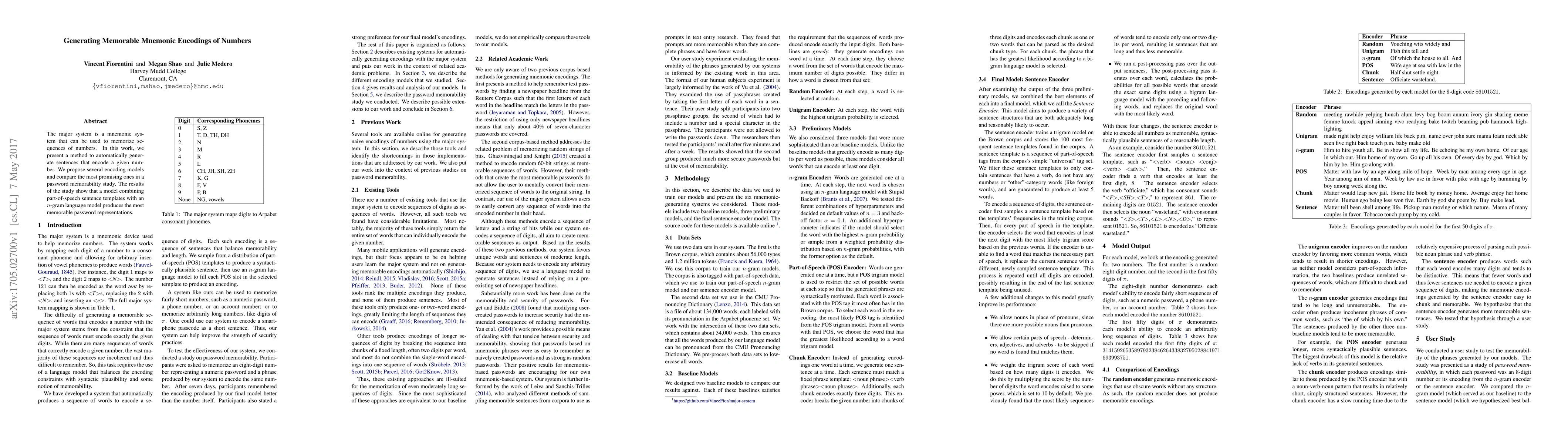 The major system is a mnemonic system that can be used to memorize sequences of numbers. In this work, we present a method to automatically generate sentences that encode a given number. We propose several encoding models and compare the most promising ones in a password memorability study. The results of the study show that a model combining part-of-speech sentence templates with an $n$-gram language model produces the most memorable password representations.