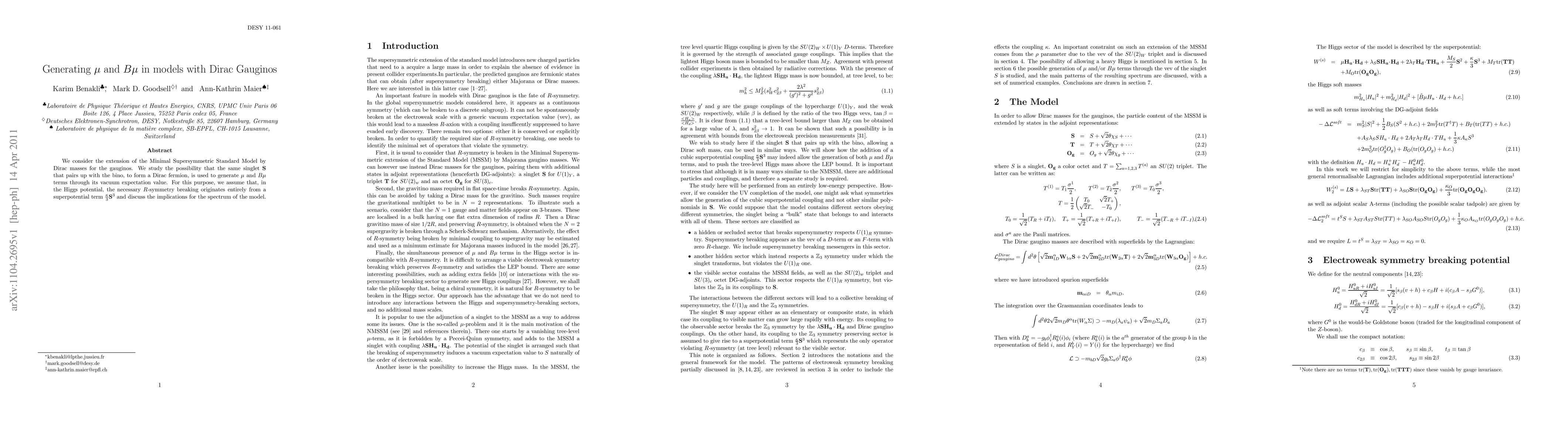 This paper explores the Minimal Supersymmetric Standard Model with Dirac gauginos, proposing a mechanism where a singlet field generates both the mu and Bmu terms via its vacuum expectation value, driven by R-symmetry breaking from a cubic superpotential term, and discusses the resulting implications for the model's spectrum.