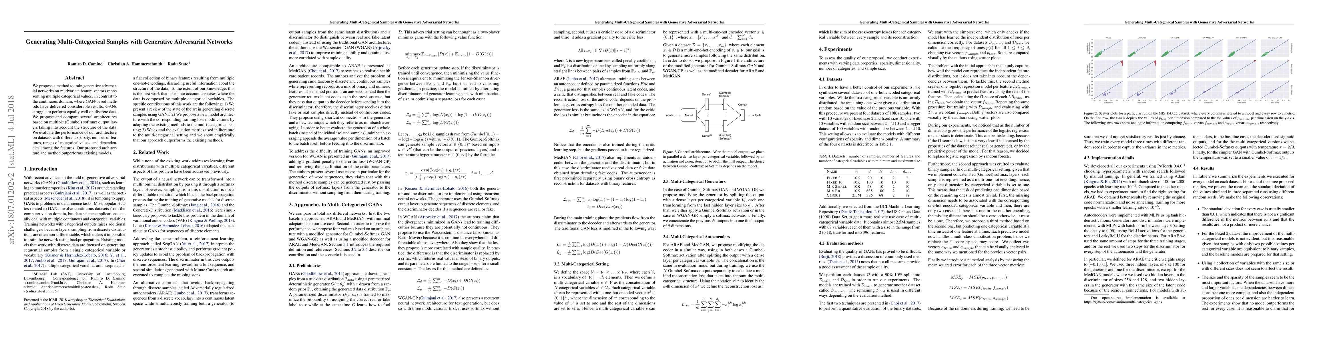 This research introduces a novel method to train Generative Adversarial Networks (GANs) on discrete, multi-categorical data, addressing GANs' typical struggle with such datasets. The proposed architecture, utilizing multiple Gumbel softmax layers, outperforms existing models in various evaluations across different dataset characteristics.