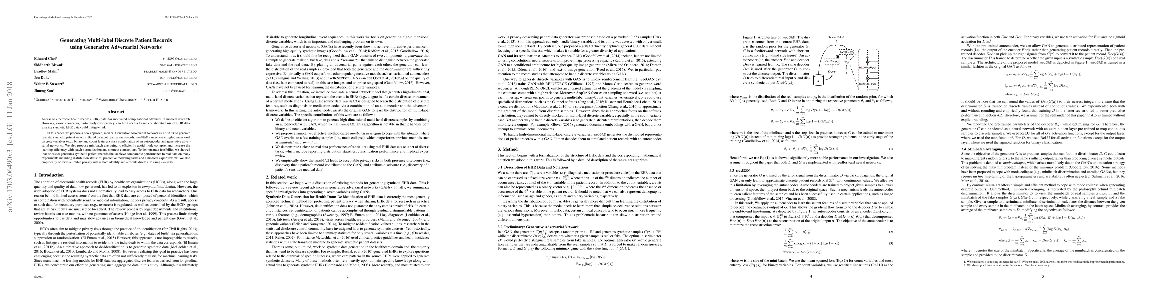 This paper proposes medGAN, a novel Generative Adversarial Network (GAN) approach to generate synthetic electronic health record (EHR) data, addressing privacy concerns. The method combines an autoencoder with GANs to produce high-dimensional discrete variables, demonstrating comparable performance to real data in various experiments and showing limited privacy risks.