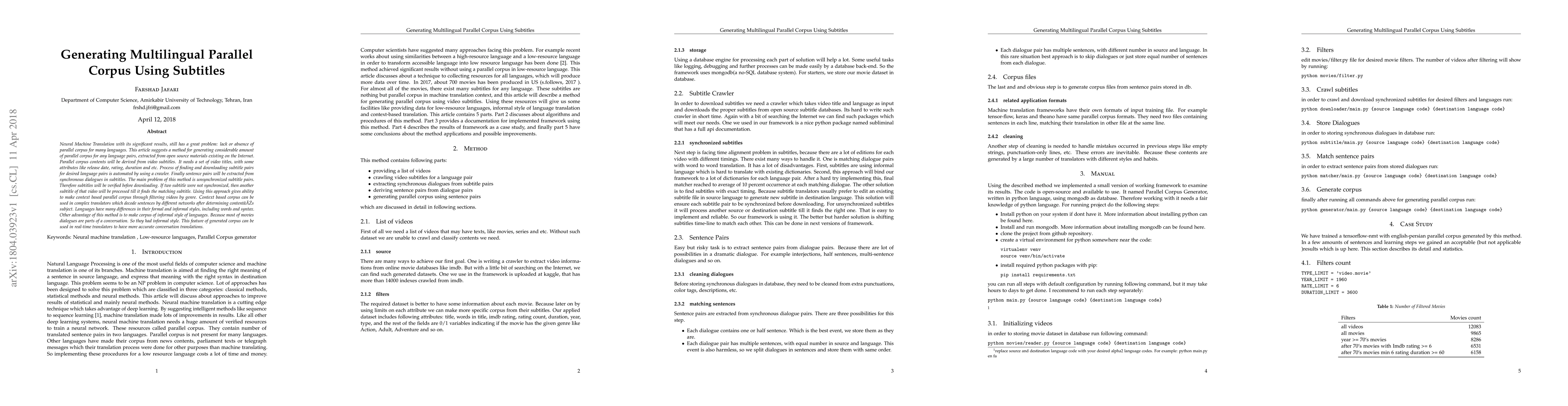 Neural Machine Translation with its significant results, still has a great problem: lack or absence of parallel corpus for many languages. This article suggests a method for generating considerable amount of parallel corpus for any language pairs, extracted from open source materials existing on the Internet. Parallel corpus contents will be derived from video subtitles. It needs a set of video titles, with some attributes like release date, rating, duration and etc. Process of finding and downloading subtitle pairs for desired language pairs is automated by using a crawler. Finally sentence pairs will be extracted from synchronous dialogues in subtitles. The main problem of this method is unsynchronized subtitle pairs. Therefore subtitles will be verified before downloading. If two subtitle were not synchronized, then another subtitle of that video will be processed till it finds the matching subtitle. Using this approach gives ability to make context based parallel corpus through filtering videos by genre. Context based corpus can be used in complex translators which decode sentences by different networks after determining contents subject. Languages have many differences in their formal and informal styles, including words and syntax. Other advantage of this method is to make corpus of informal style of languages. Because most of movies dialogues are parts of a conversation. So they had informal style. This feature of generated corpus can be used in real-time translators to have more accurate conversation translations.
