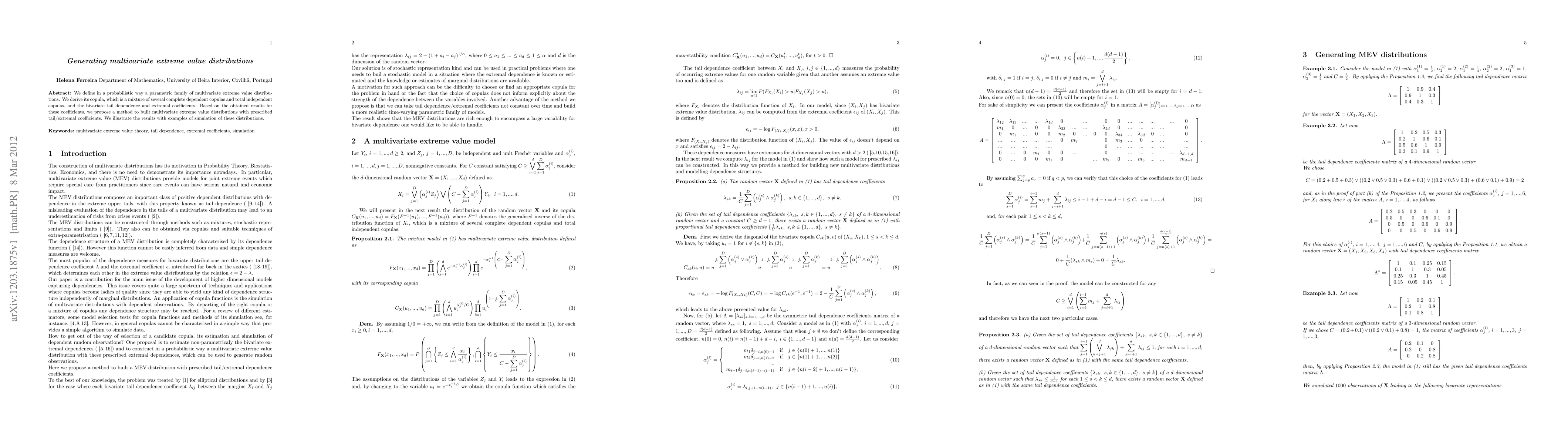 We define in a probabilistic way a parametric family of multivariate extreme value distributions. We derive its copula, which is a mixture of several complete dependent copulas and total independent copulas, and the bivariate tail dependence and extremal coefficients. Based on the obtained results for these coefficients, we propose a method to built multivariate extreme value distributions with prescribed tail/extremal coefficients. We illustrate the results with examples of simulation of these distributions.