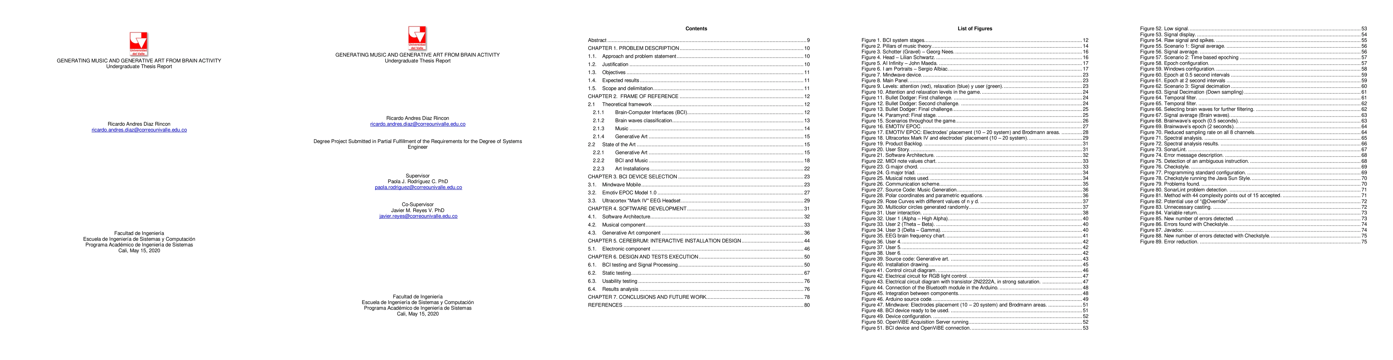 Nowadays, technological advances have influenced all human activities, creating new dynamics and ways of communication. In this context, some artists have incorporated these advances in their creative process, giving rise to unique aesthetic expressions referred to in the literature as Generative Art, which is characterized by assigning part of the creative process to a system that acts with certain autonomy (Galanter, 2003). This research work introduces a computational system for creating generative art using a Brain-Computer Interface (BCI) which portrays the user's brain activity in a digital artwork. In this way, the user takes an active role in the creative process. In aims of showing that the proposed system materializes in an artistic piece the user's mental states by means of a visual and sound representation, several tests are carried out to ensure the reliability of the BCI device sent data. The generated artwork uses brain signals and concepts of geometry, color and spatial location to give complexity to the autonomous construction. As an added value, the visual and auditory production is accompanied by an olfactory and kinesthetic component which complements the art pieces providing a multimodal communication character.