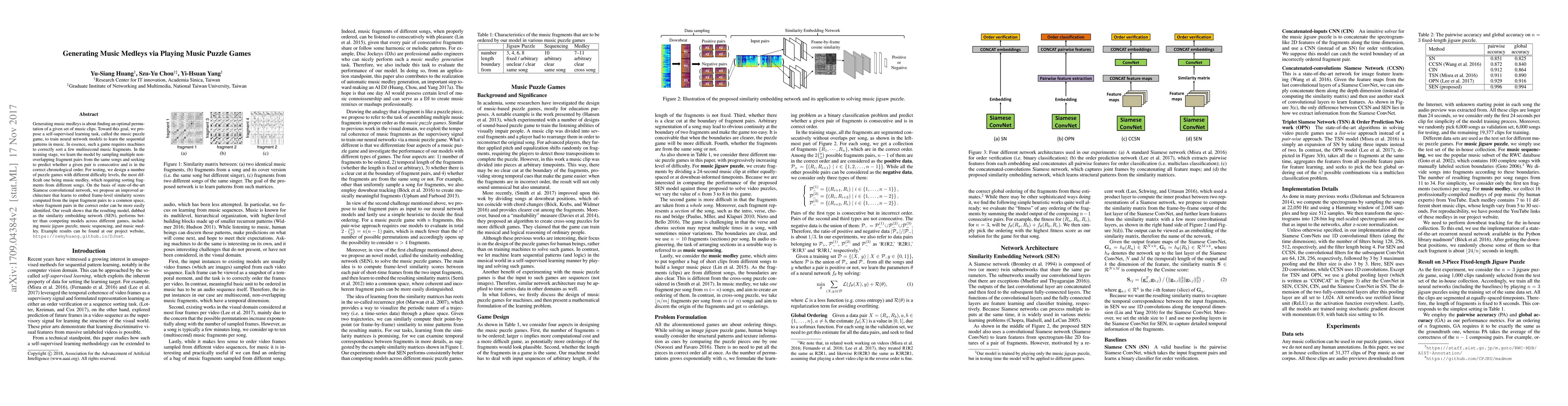 Researchers created a self-supervised learning task called the music puzzle game to train neural networks to sort music fragments in chronological order. Their proposed architecture, the similarity embedding network (SEN), outperforms competing models across various games.