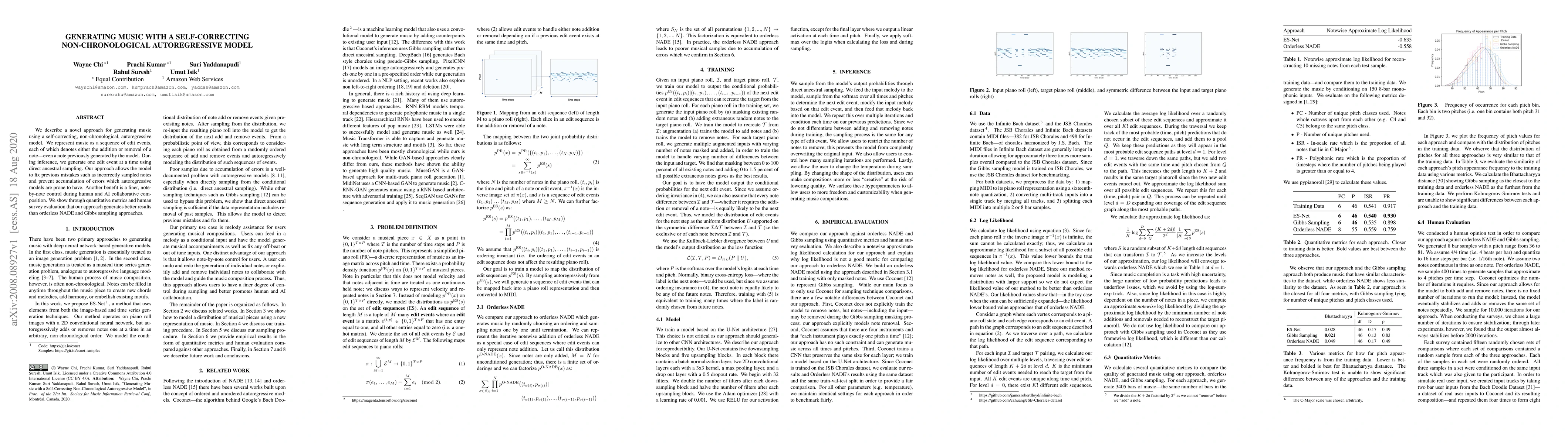 We describe a novel approach for generating music using a self-correcting, non-chronological, autoregressive model. We represent music as a sequence of edit events, each of which denotes either the addition or removal of a note---even a note previously generated by the model. During inference, we generate one edit event at a time using direct ancestral sampling. Our approach allows the model to fix previous mistakes such as incorrectly sampled notes and prevent accumulation of errors which autoregressive models are prone to have. Another benefit is a finer, note-by-note control during human and AI collaborative composition. We show through quantitative metrics and human survey evaluation that our approach generates better results than orderless NADE and Gibbs sampling approaches.