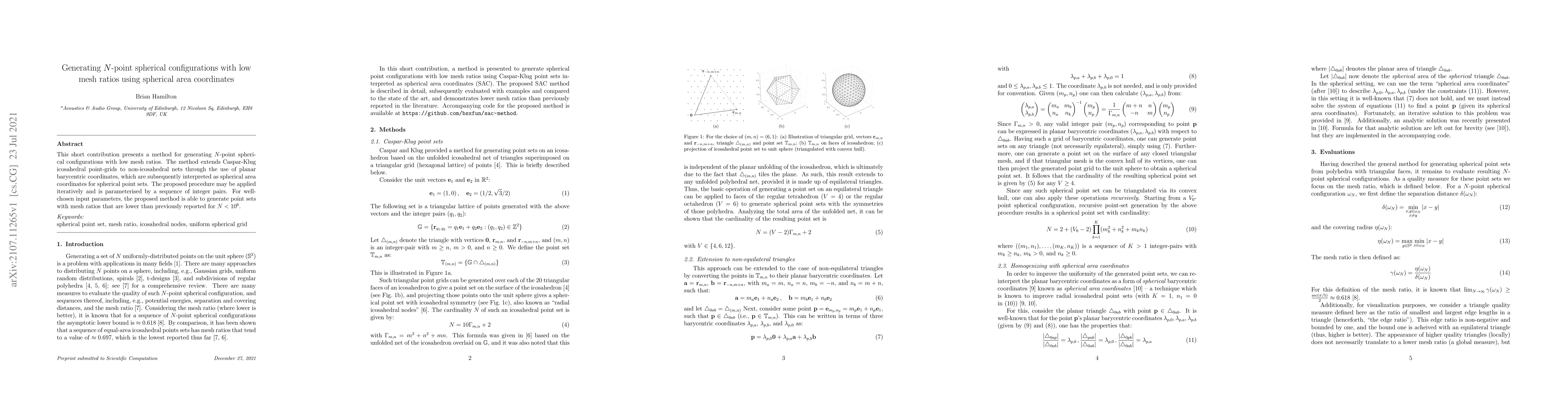 A method for generating N-point spherical configurations with low mesh ratios using spherical area coordinates is presented, improving upon existing methods for large N.
