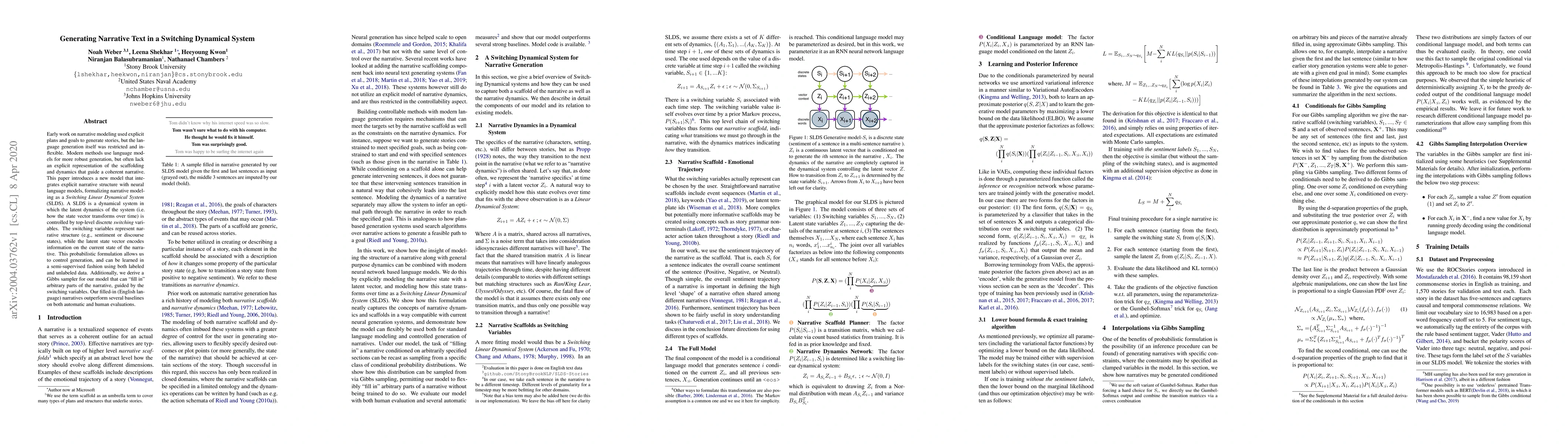 This paper proposes a Switching Linear Dynamical System (SLDS) to integrate explicit narrative structure with neural language models, enabling more coherent and controllable narrative text generation. The model uses switching variables to represent narrative structure and outperforms baselines in both automatic and human evaluations.