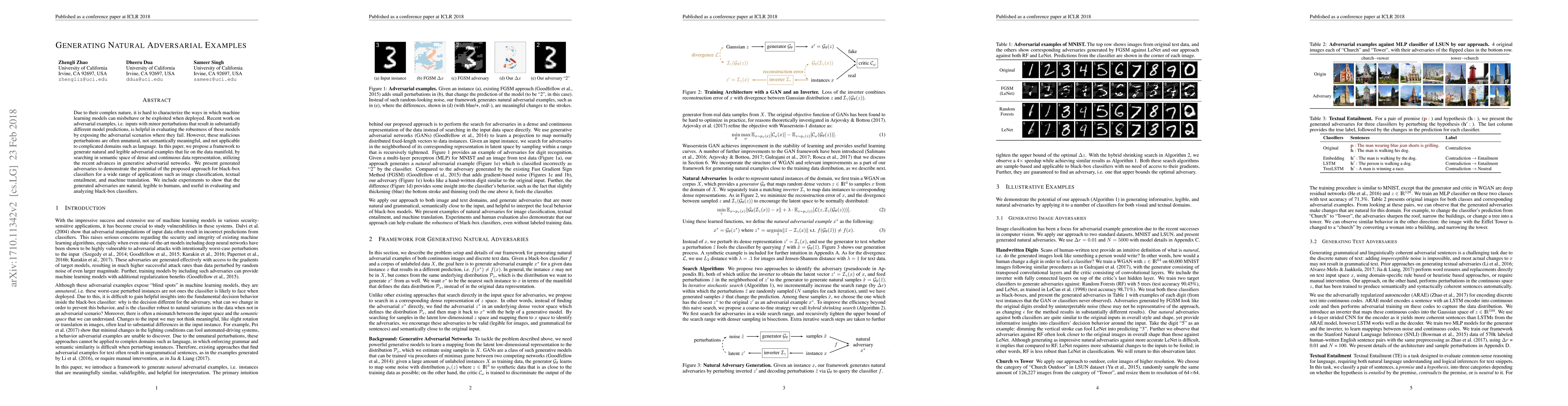 This paper proposes a framework for generating natural adversarial examples that are semantically meaningful and lie on the data manifold, using advances in generative adversarial networks. The generated adversarial examples are shown to be useful in evaluating black-box classifiers across applications like image classification, textual entailment, and machine translation.