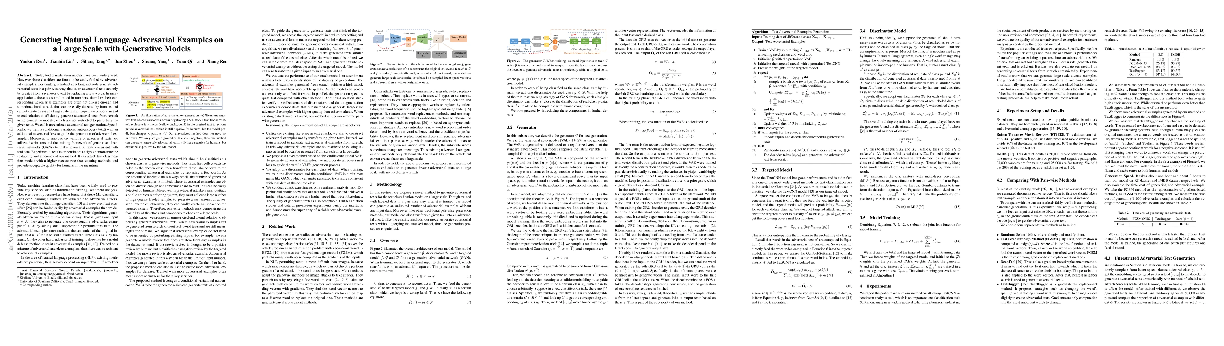 This paper proposes a method for generating diverse and natural adversarial examples for text classification using generative models, specifically a conditional variational autoencoder with adversarial loss, and GANs to ensure text consistency. The approach achieves higher attack success rates than traditional pair-wise methods while maintaining readability.