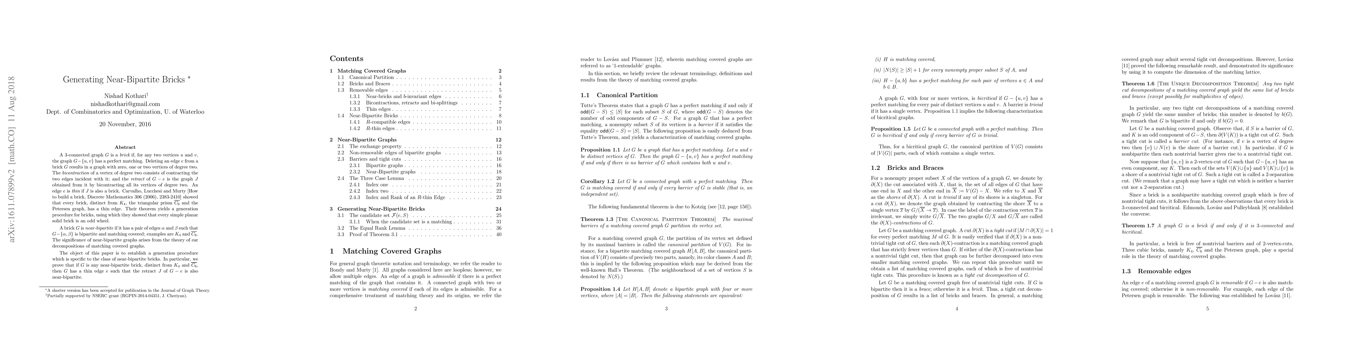 This paper establishes a generation procedure for near-bipartite bricks, a specific subclass of 3-connected graphs where removing two edges results in a bipartite and matching covered graph. It proves that any near-bipartite brick, excluding $K_4$ and $\overline{C_6}$, contains a "thin" edge whose removal leaves a near-bipartite retract. This lays the groundwork for a generation theorem for simple near-bipartite bricks.