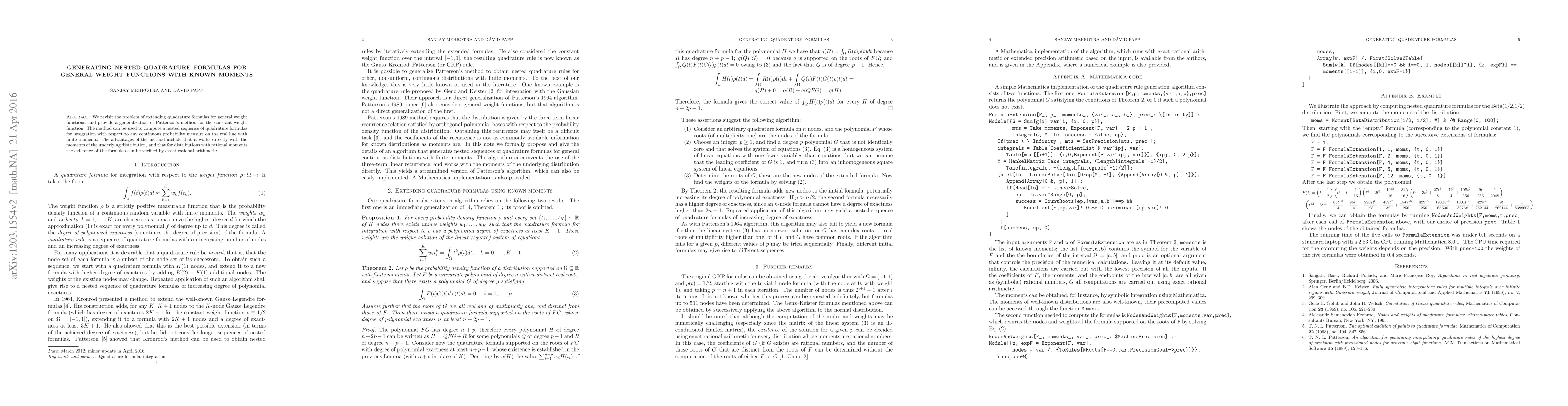 We revisit the problem of extending quadrature formulas for general weight functions, and provide a generalization of Patterson's method for the constant weight function. The method can be used to compute a nested sequence of quadrature formulas for integration with respect to any continuous probability measure on the real line with finite moments. The advantages of the method include that it works directly with the moments of the underlying distribution, and that for distributions with rational moments the existence of the formulas can be verified by exact rational arithmetic.