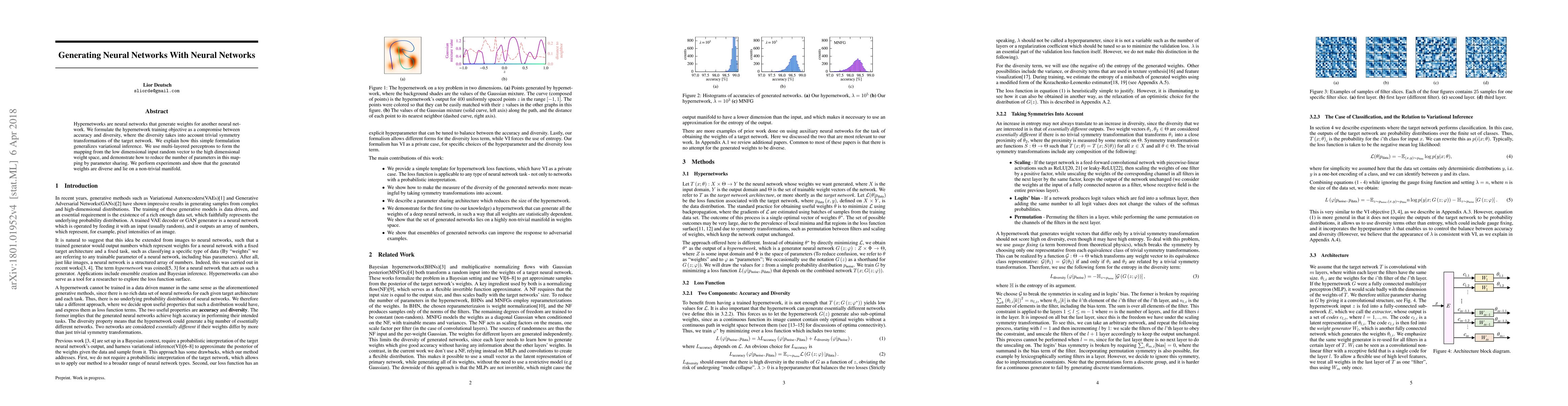 Hypernetworks are neural networks that generate weights for another neural network. We formulate the hypernetwork training objective as a compromise between accuracy and diversity, where the diversity takes into account trivial symmetry transformations of the target network. We explain how this simple formulation generalizes variational inference. We use multi-layered perceptrons to form the mapping from the low dimensional input random vector to the high dimensional weight space, and demonstrate how to reduce the number of parameters in this mapping by parameter sharing. We perform experiments and show that the generated weights are diverse and lie on a non-trivial manifold.