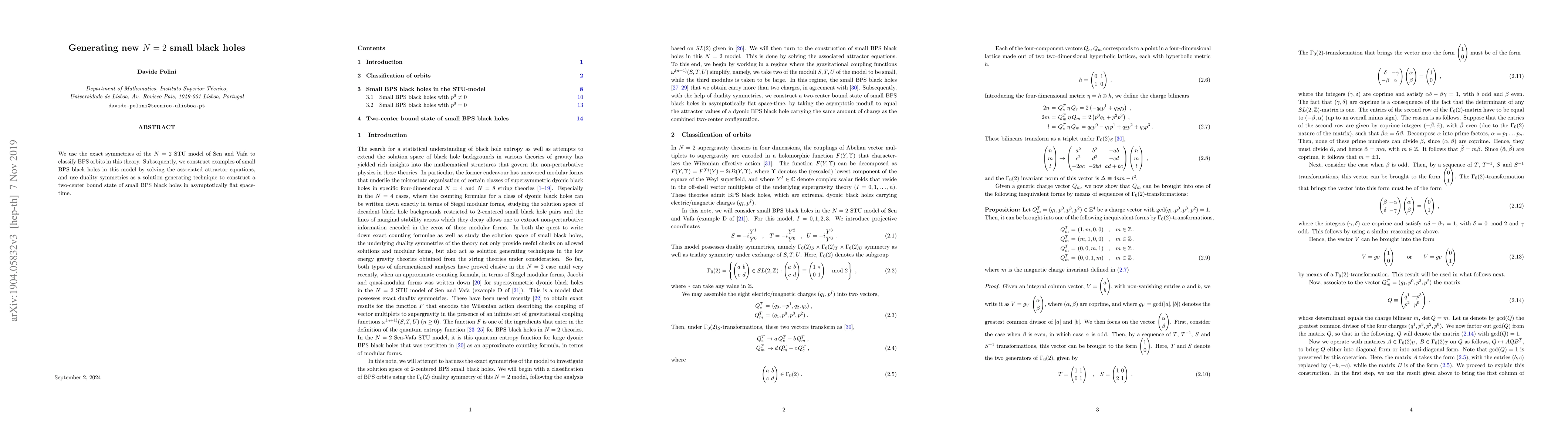 This paper classifies BPS orbits in the $N = 2$ STU model using its exact symmetries, and constructs small BPS black holes by solving attractor equations and employing duality symmetries to generate two-center bound states in asymptotically flat space-time.