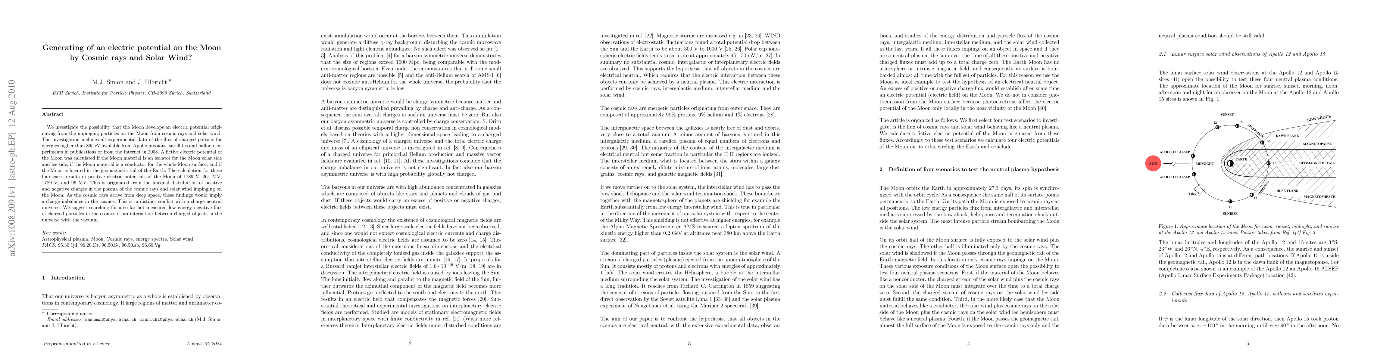 This paper investigates the generation of an electric potential on the Moon due to cosmic rays and solar wind, finding potentials of 1789 V, 261 MV, 1789 V, and 96 MV under different lunar material conductivities. It suggests a charge imbalance in cosmic rays and solar wind, conflicting with the assumption of a charge-neutral universe.
