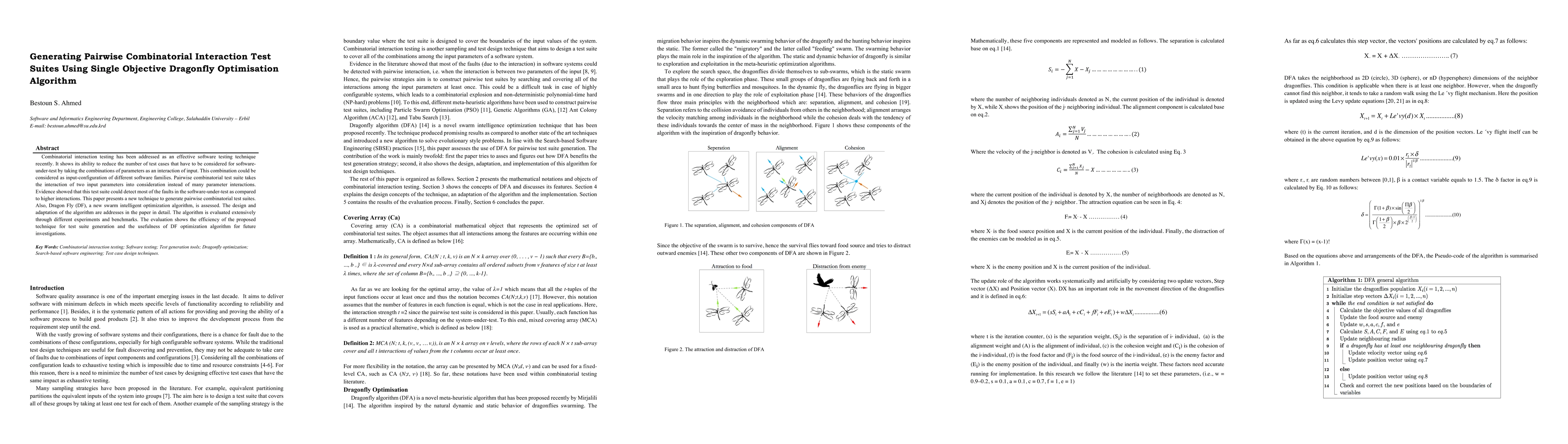 Combinatorial interaction testing has been addressed as an effective software testing technique recently. It shows its ability to reduce the number of test cases that have to be considered for software-under-test by taking the combinations of parameters as an interaction of input. This combination could be considered as input-configuration of different software families. Pairwise combinatorial test suite takes the interaction of two input parameters into consideration instead of many parameter interactions. Evidence showed that this test suite could detect most of the faults in the software-under-test as compared to higher interactions. This paper presents a new technique to generate pairwise combinatorial test suites. Also, Dragon Fly (DF), a new swarm intelligent optimization algorithm, is assessed. The design and adaptation of the algorithm are addresses in the paper in detail. The algorithm is evaluated extensively through different experiments and benchmarks. The evaluation shows the efficiency of the proposed technique for test suite generation and the usefulness of DF optimization algorithm for future investigations.