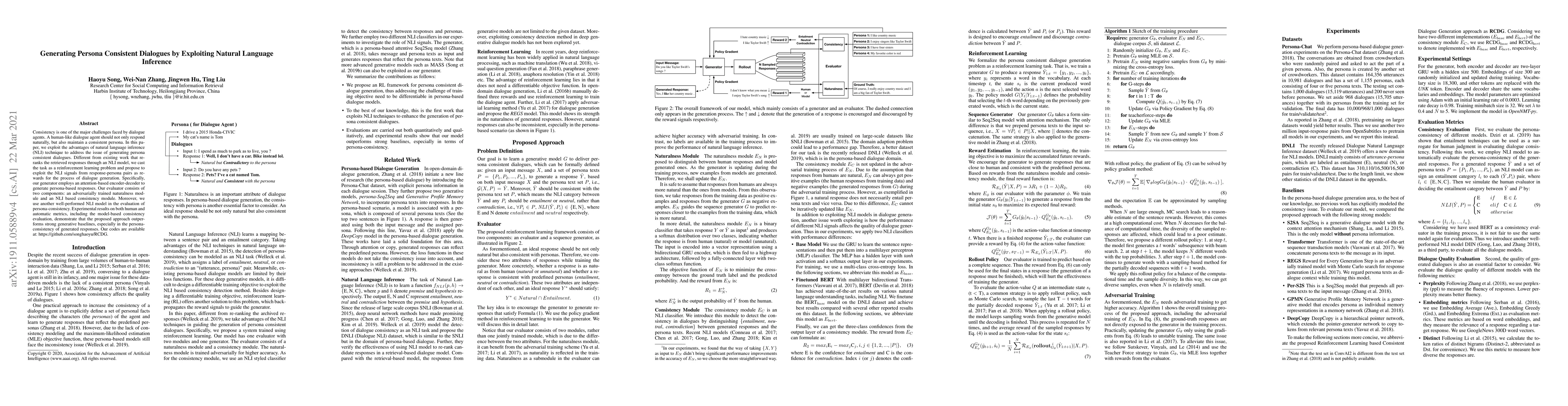 This paper proposes a reinforcement learning framework to generate persona-consistent dialogues using natural language inference (NLI). The approach employs an encoder-decoder model and dual evaluator modules, achieving superior persona-consistency compared to baselines.