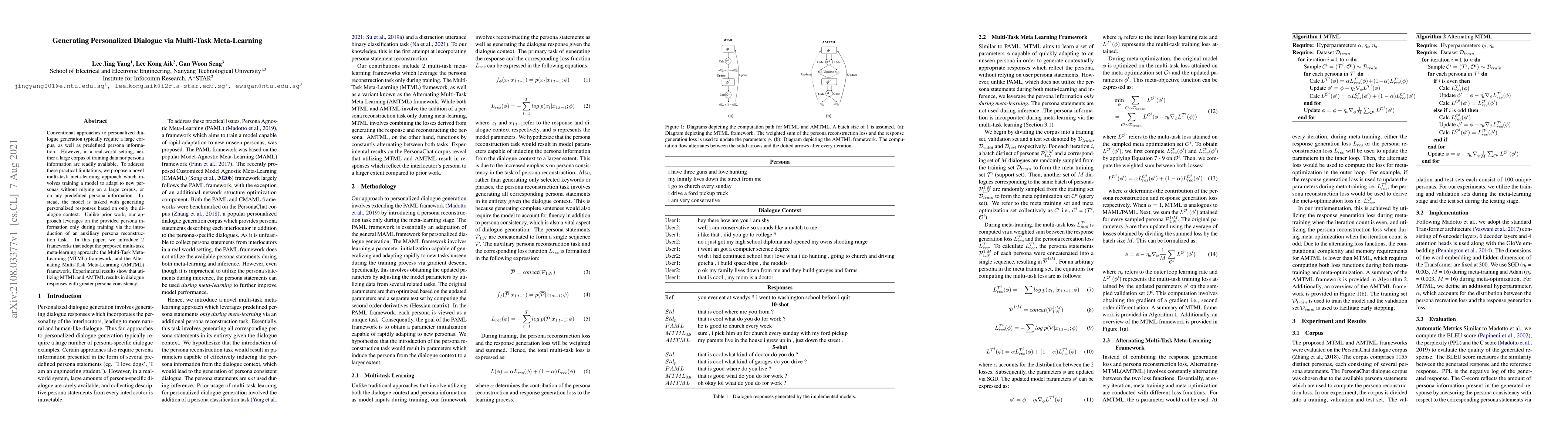 This paper proposes a multi-task meta-learning approach for generating personalized dialogue without requiring large datasets or predefined persona information. The introduced frameworks, MTML and AMTML, achieve better persona consistency by leveraging an auxiliary persona reconstruction task during training.