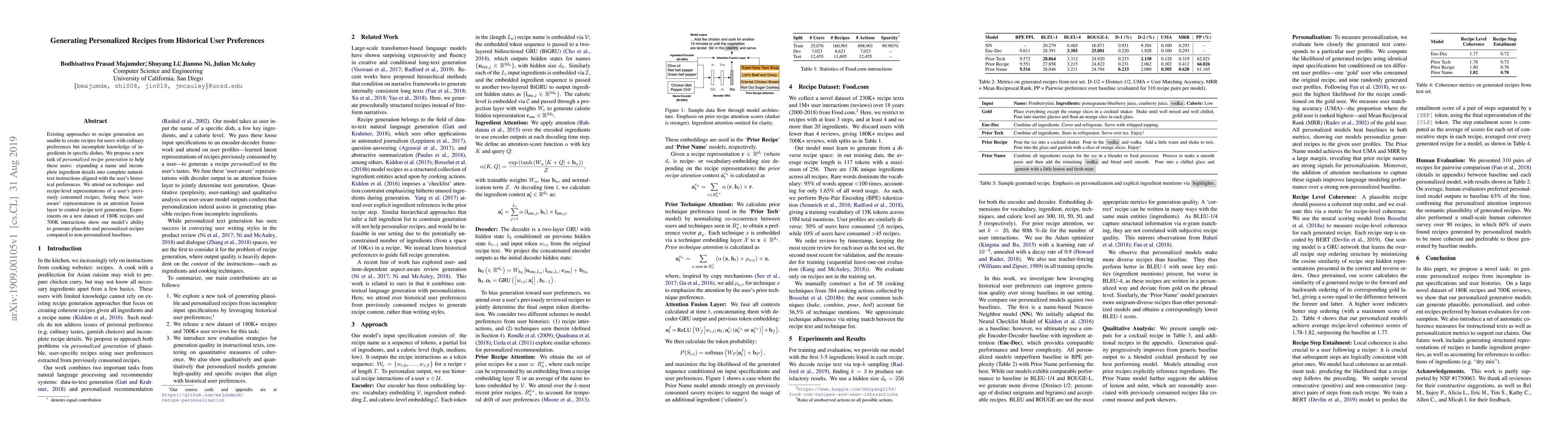 This research paper proposes a new approach to generating personalized recipes based on users' historical preferences, using attention fusion layers to control recipe text generation. The model outperforms non-personalized baselines in generating plausible and personalized recipes.
