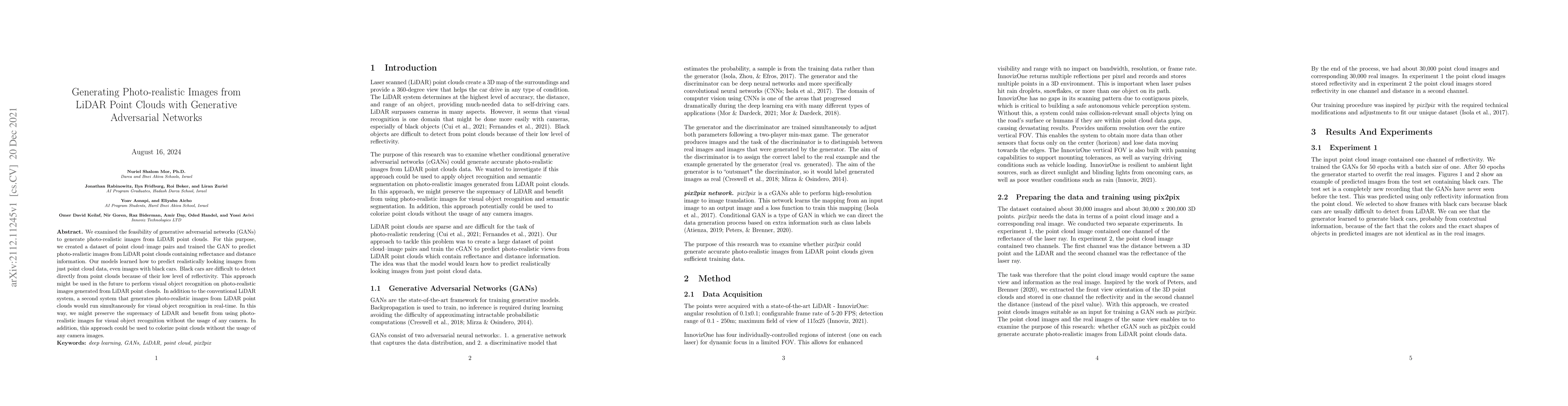 This research explores the use of GANs to generate photo-realistic images from LiDAR point clouds, demonstrating the ability to predict realistic images even for low-reflectivity objects like black cars. The potential application includes real-time visual object recognition using generated images, preserving LiDAR's advantages while leveraging photo-realistic visuals.