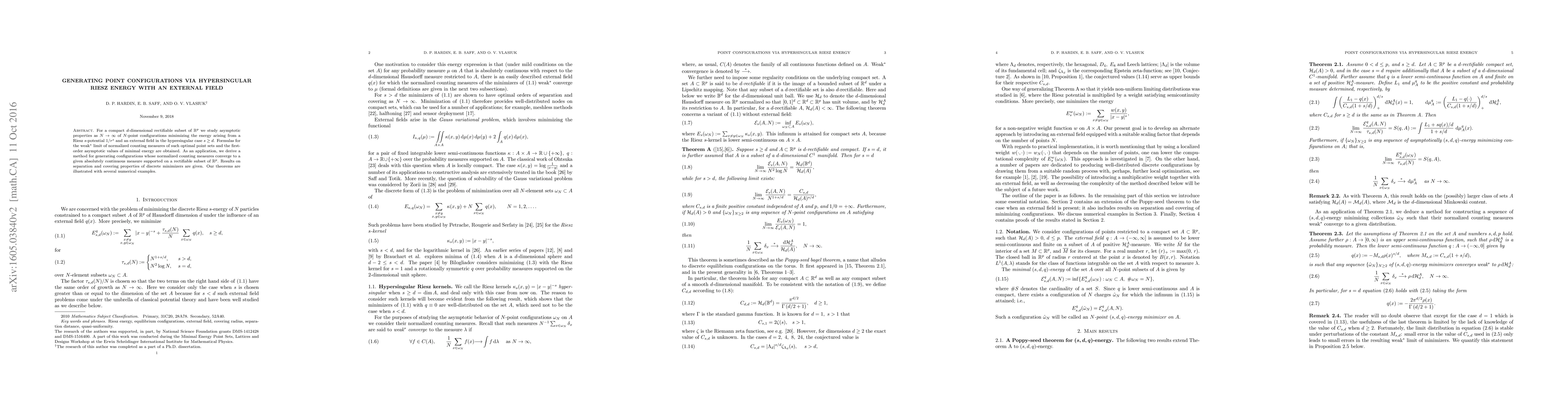 For a compact $ d $-dimensional rectifiable subset of $ \mathbb{R}^{p} $ we study asymptotic properties as $ N\to\infty $ of $N$-point configurations minimizing the energy arising from a Riesz $ s $-potential $ 1/r^s $ and an external field in the hypersingular case $ s\geq d$. Formulas for the weak$ ^* $ limit of normalized counting measures of such optimal point sets and the first-order asymptotic values of minimal energy are obtained. As an application, we derive a method for generating configurations whose normalized counting measures converge to a given absolutely continuous measure supported on a rectifiable subset of $ \mathbb{R}^{p} $. Results on separation and covering properties of discrete minimizers are given. Our theorems are illustrated with several numerical examples.