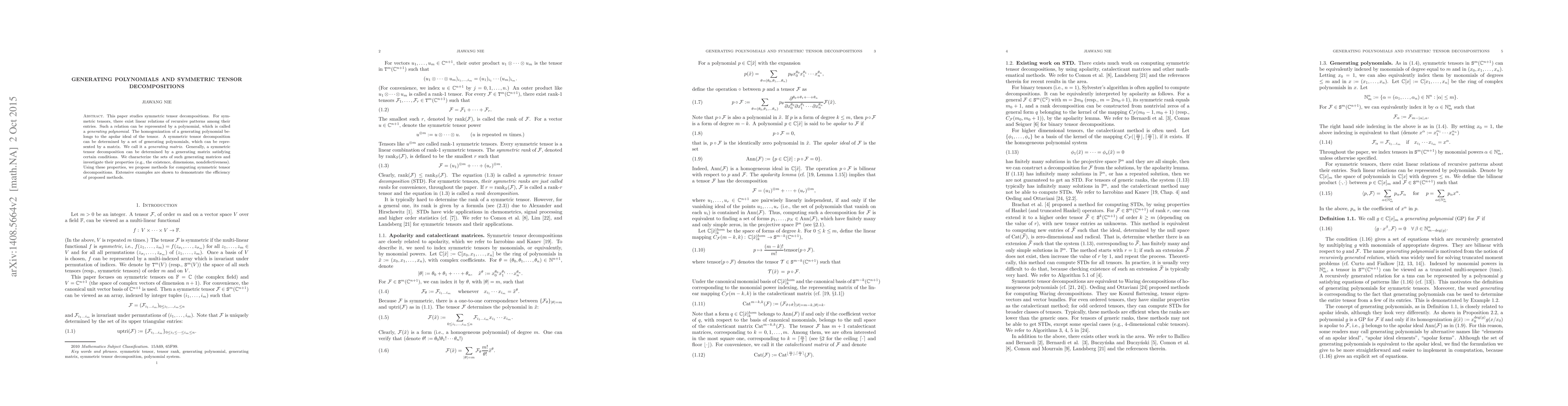 This paper explores symmetric tensor decompositions through generating polynomials and matrices, characterizing conditions for these matrices and proposing methods to compute decompositions, supported by examples demonstrating efficiency.
