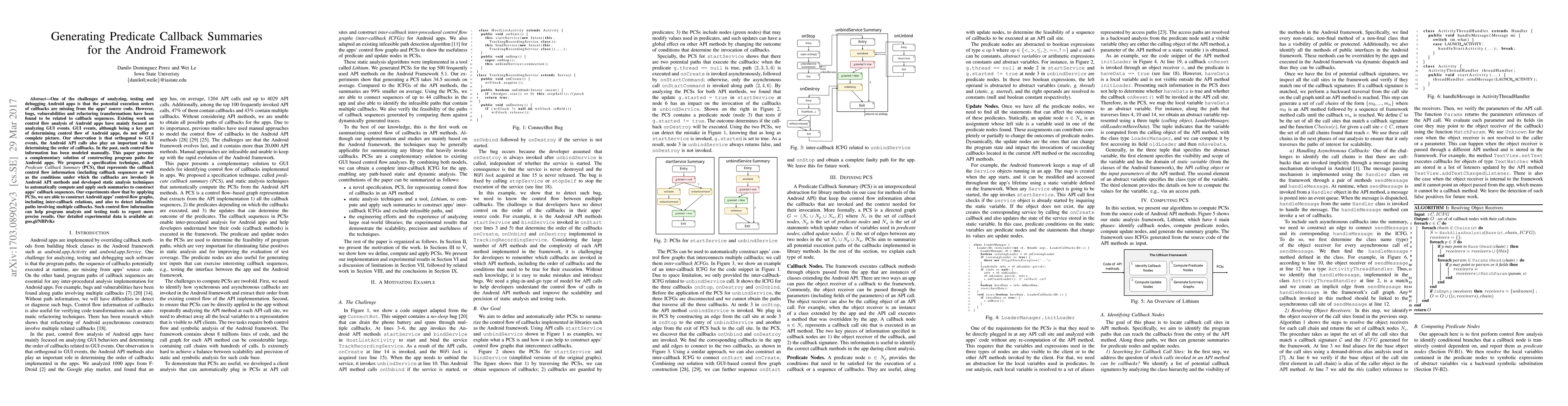 This paper proposes a Predicate Callback Summary (PCS) technique to automatically generate control flow information for Android apps, focusing on the sequence and conditions of callbacks. The method enhances program analysis and testing tools by constructing detailed control flow graphs and detecting infeasible paths.
