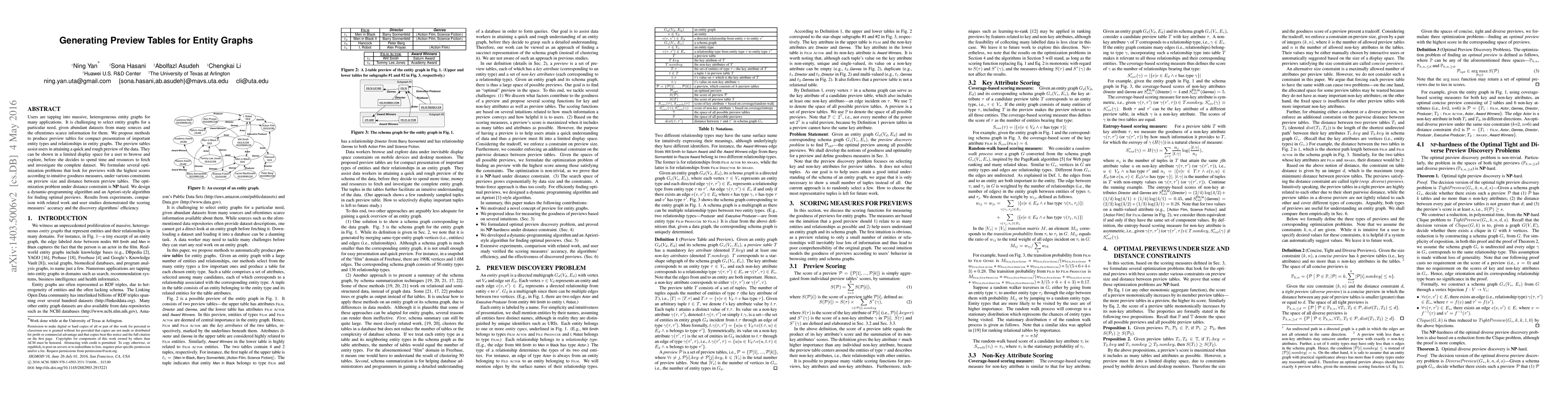 This paper proposes methods to generate preview tables for entity graphs to help users quickly explore large datasets. It formulates optimization problems to find optimal previews based on intuitive measures, and presents efficient algorithms to solve them, validated by experiments and user studies.