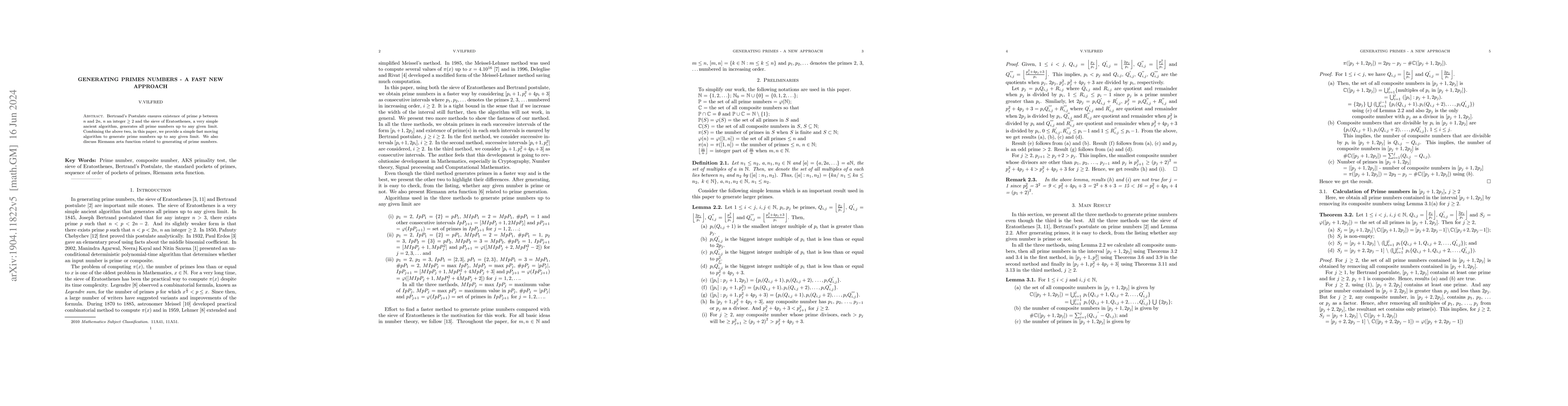 Title: Generating Prime Numbers -- A Fast New Method Abstract: This paper introduces an efficient algorithm to generate prime numbers up to a specified limit by combining Bertrand's Postulate and the sieve of Eratosthenes, alongside discussing its relation to the Riemann zeta function.