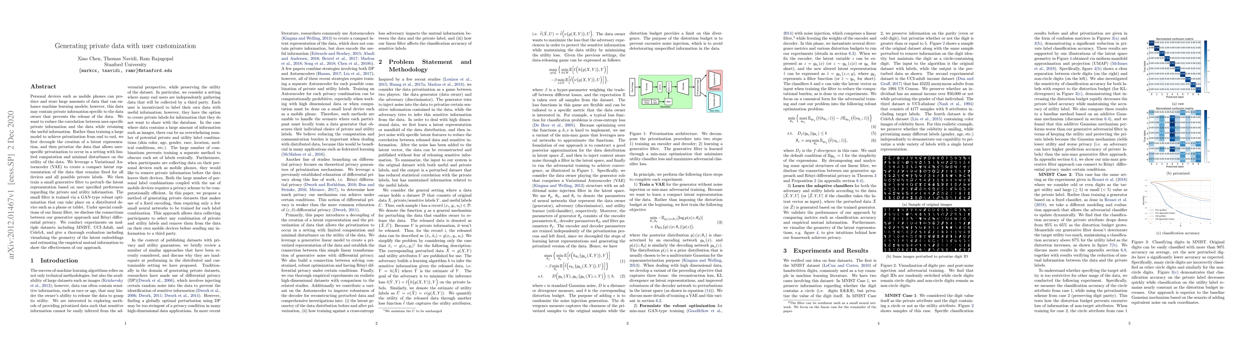 This paper proposes a method to generate private data with user customization by decoupling the latent representation of personal data using a Variational Autoencoder (VAE) and then applying a small generative filter to perturb the latent data based on user preferences. This approach ensures privacy while maintaining data utility, leveraging a GAN-type robust optimization for efficient implementation on personal devices.