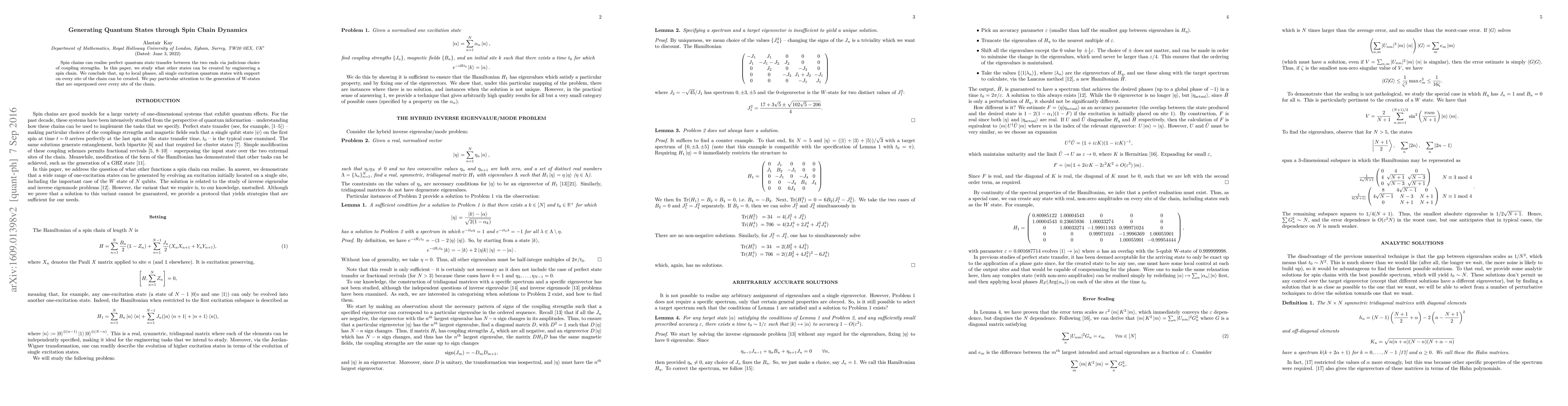 This paper explores the potential of spin chains to generate various quantum states, including W-states, through precise control of coupling strengths. It concludes that all single excitation quantum states with support on every site of the chain can be created, up to local phases.
