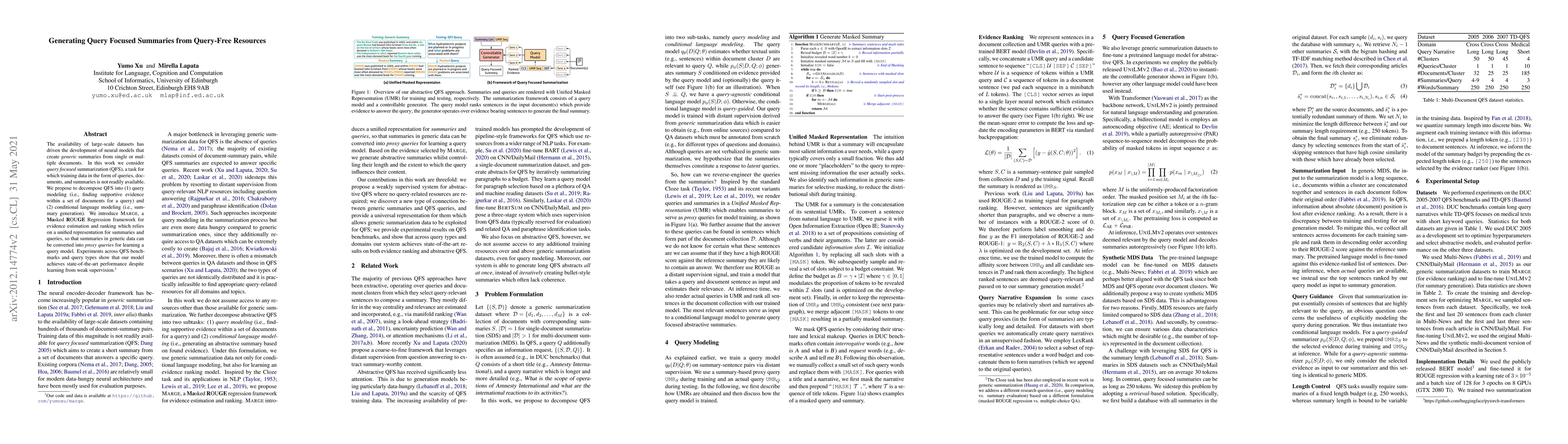 This paper proposes MaRGE, a Masked ROUGE Regression framework for generating query-focused summaries from query-free resources by decomposing the task into query modeling and conditional language modeling. Despite learning from weak supervision, MaRGE achieves state-of-the-art performance on query-focused summarization benchmarks.