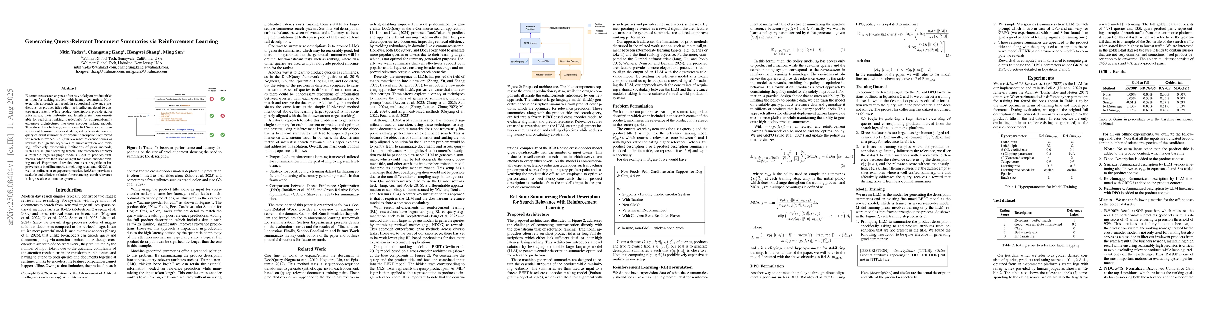 E-commerce search engines often rely solely on product titles as input for ranking models with latency constraints. However, this approach can result in suboptimal relevance predictions, as product titles often lack sufficient detail to capture query intent. While product descriptions provide richer information, their verbosity and length make them unsuitable for real-time ranking, particularly for computationally expensive architectures like cross-encoder ranking models. To address this challenge, we propose ReLSum, a novel reinforcement learning framework designed to generate concise, query-relevant summaries of product descriptions optimized for search relevance. ReLSum leverages relevance scores as rewards to align the objectives of summarization and ranking, effectively overcoming limitations of prior methods, such as misaligned learning targets. The framework employs a trainable large language model (LLM) to produce summaries, which are then used as input for a cross-encoder ranking model. Experimental results demonstrate significant improvements in offline metrics, including recall and NDCG, as well as online user engagement metrics. ReLSum provides a scalable and efficient solution for enhancing search relevance in large-scale e-commerce systems.