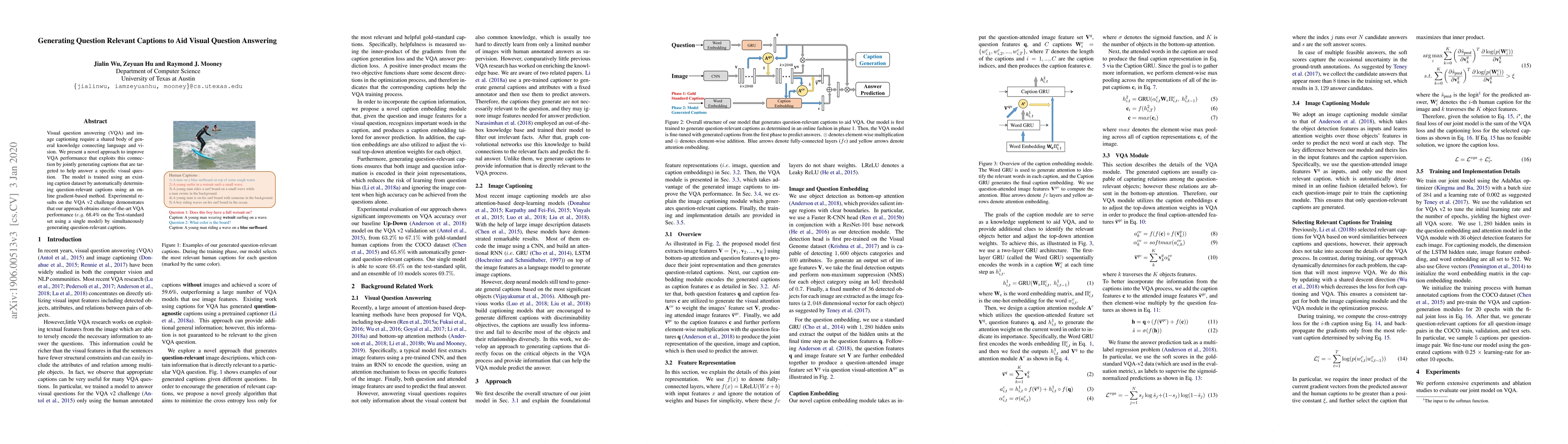 This paper proposes a method to enhance visual question answering (VQA) by generating targeted captions that aid in answering specific questions. The approach trains a model using an existing caption dataset and an online gradient-based method to determine question-relevant captions, achieving state-of-the-art results on the VQA v2 challenge.